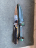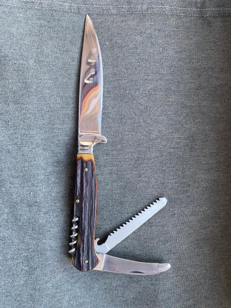Universal-Jagd-Nicker mit ausklappbaren Zusatzklingen „ HUBERTUS Solingen“, feststehende Klinge mit 11,5 cm Schneide & ausklappbarer Säge (6,5 cm) inkl. Kapselheber, Aufbruchklinge (7,5 cm), Korkenzieher und Lederscheide: Sehr guter Zustand