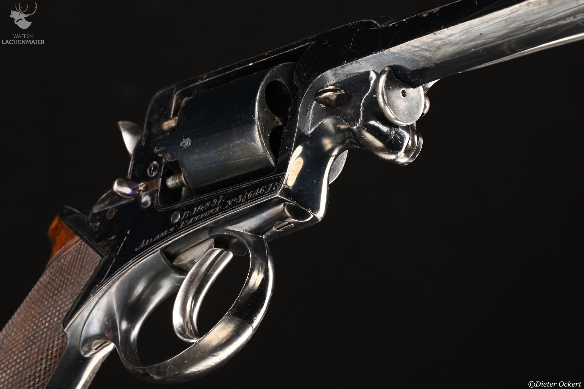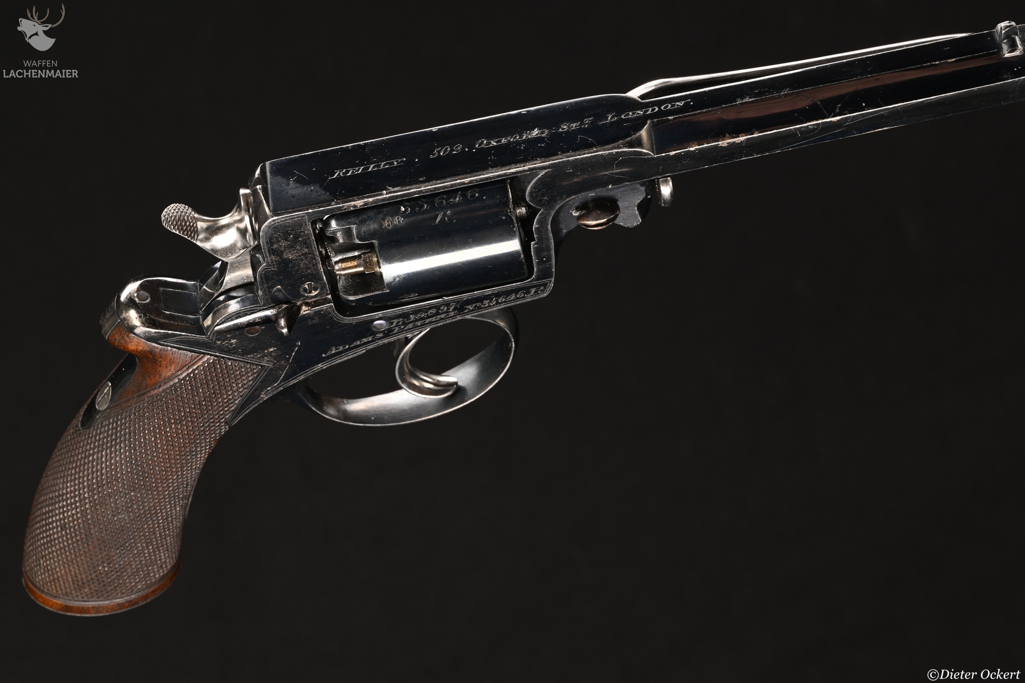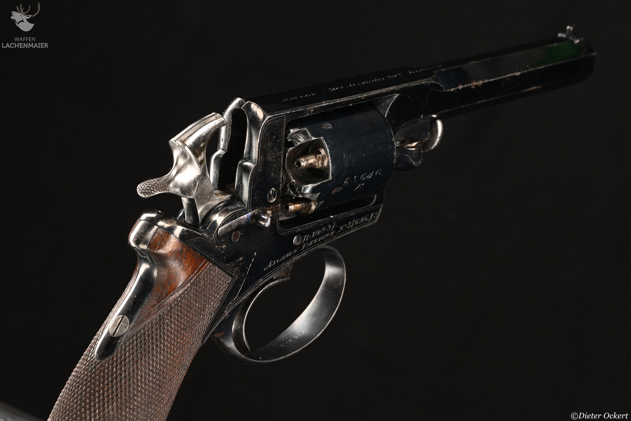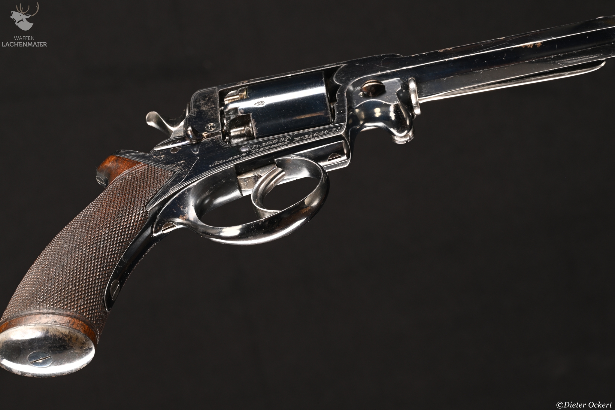 With blued octagonal sighted barrel stamped 'L.A.C.' along one side, blued top-strap engraved with retailer's name and Address, blued serial numbered cylinder, blued border engraved frame with serial numbers and 'Adams' Patent' on the right side, blued safety-stop, bright arbor pin, rammer, hammer and trigger, blued trigger-guard and butt-cap, chequered figured rounded butt, and nearly all its original finish: in original fitted oak case lined in blue baize with accessories including G. & J.W. Hawksley powder-flask (some loss of finish), and brass bullet mould stamped with retailer's name and address, the exterior with circular brass escutcheon engraved with owner's monogram 'EB', London proof marks 11.2 cm. barrel