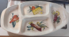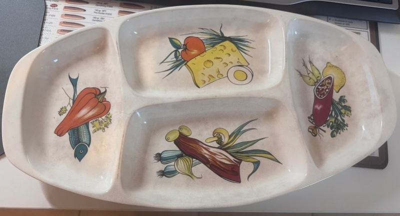 Die Platte ist in klassischer Form mit mehreren Unterteilungen ausgeführt und mit einem dekorativen Lebensmittel-/Küchenmotiv verziert (Fisch, Käse, Wurst, Gemüse).