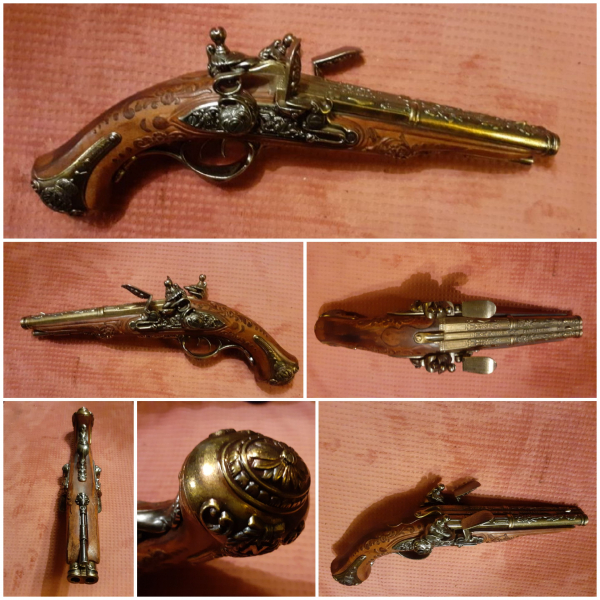 Privatauktion , wie üblich keine Gewährleistung oder Rücknahme,keine Eigeninterpretationen, keine nachträgliche Nörgelei,Gebraucht. Zustand so wie den Bildern. Sehr hochwertig angefertigter Nachbau einer doppelläufigen Steinschloßpistole .Dss Original war im Besitz von Kaiser Napoleon . Die Hähne lassen sich spannen und abschlagen usw..
