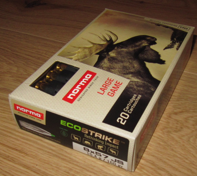 Sie bieten auf die im Bild gezeigte Anbruch-Packung (16 Schuss) NORMA "Ecostrike" 160gr. Die grüne Polymerspitze und das "boat tail" sorgen für gute Flugeigenschaften; das Geschoss pilzt auf. .