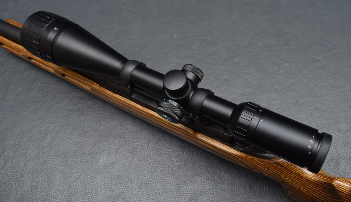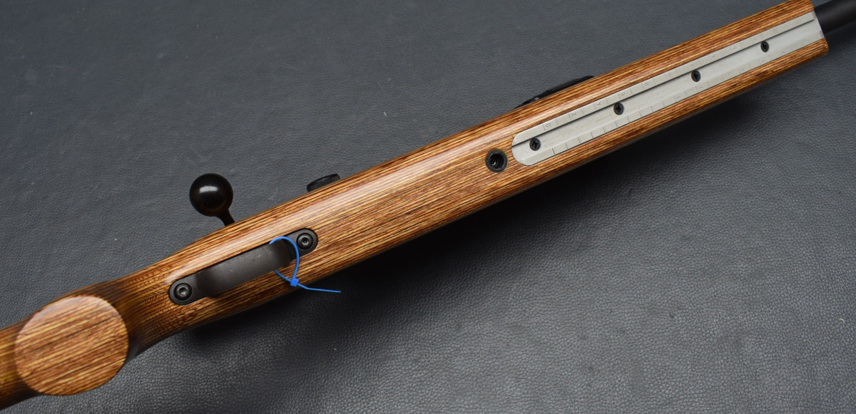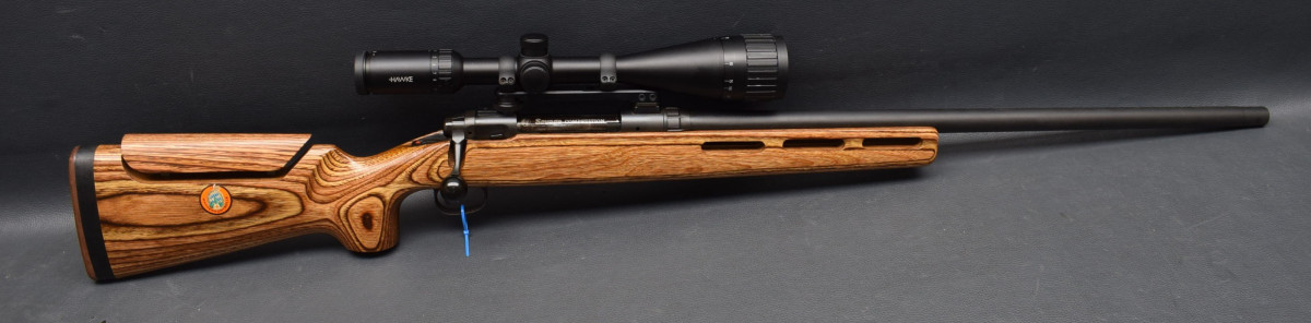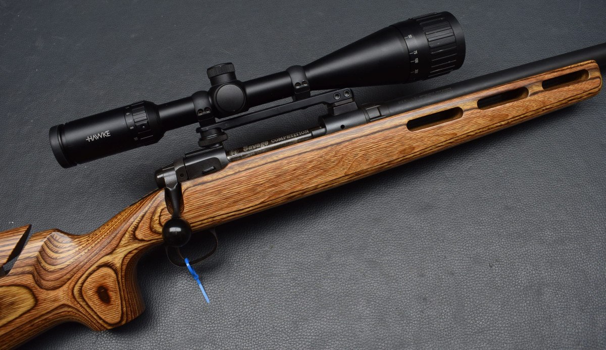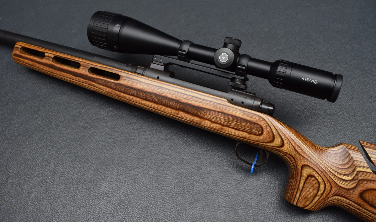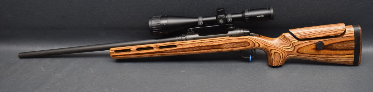 Kammerstängel mit Kugel, Direktabzug, Einzellader, Montiert mit Zielfernrohr Hawke 4-16x50AO Abs. Mil Dot rot/grün,