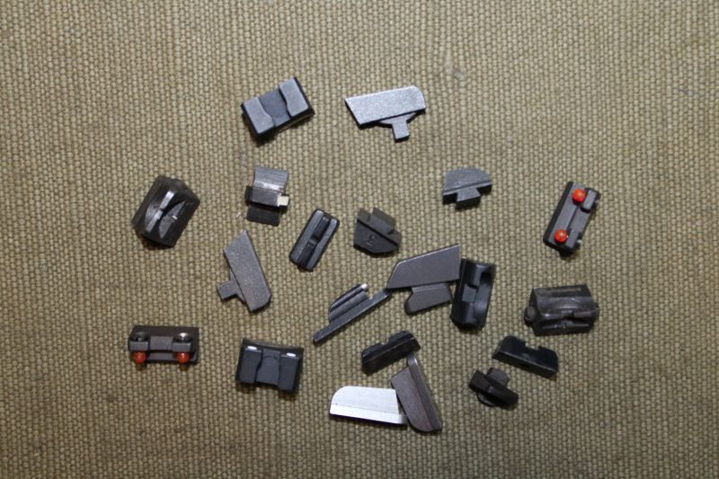 Verkaufe gebrauchte Korne (10 Stück) und gebrauchte Visiere (10 Stück), alle aus Metall.