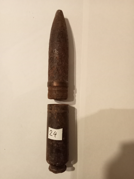 Sie bieten genau auf die hier abgebildete Patrone, eine MK 108 mit Vollgeschoss. Die Hülse aus Stahl mit E-Zündhütchen.