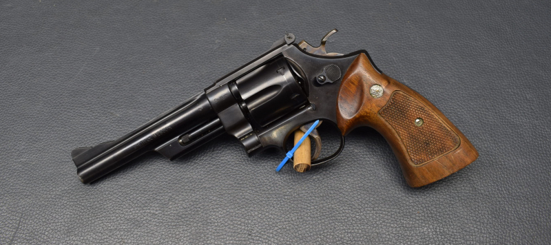 SA/DA Abzugssystem, N-Rahmen, 6-Schuss Trommel, Holzgriff mit Fischhaut und S&W Logo.