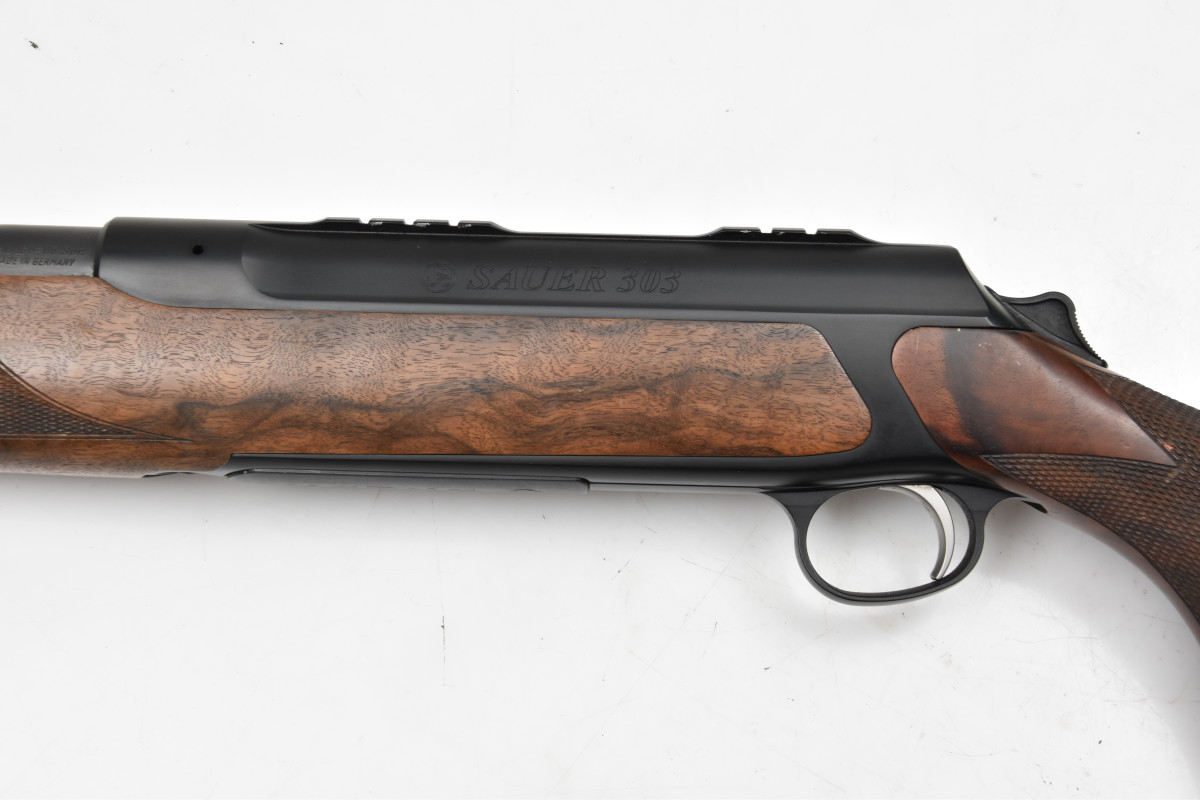 Die Sauer 303 ist mit ihrer Handspannung, dem hervorragenden Direktabzug und der herausragenden Schußleistung die einzige Selbstladebüchse, die nicht nur für die Drückjagd, sondern in vollem Umfang auch für den Ansitz geeignet ist. Das Modell Elegance besticht darüber hinaus durch den luxuriösen, eleganten und ergonomischen Monte-Carlo-Holzschaft der Holzklasse 5, durch den sie optisch kaum von einem klassischen Jagdrepetierer zu unterscheiden ist und so die Akzeptanz auch bei konservativen Waidgenossen, die „Vollernter“ im allgemeinen ablehnen, sehr hoch ist, weshalb man mit dieser Waffe kaum befürchten muß, bei einem Beständer anzuecken. Der Monte-Carlo-Schaft sorgt dafür, daß der Schütze noch sicherer und schneller seine Position hinter dem Zielfernrohr findet und so im flüchtigen Schießen mehr Zeit für die eigentliche Schußabgabe hat. Die Lauflänge beträgt 56 cm, das Einsteckmagazin ist 2-schüssig.