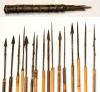 Pfeilköcher aus festem Leder, Durchmesser unten ca. 67mm, Länge 49 cm, darin 16 Original-Pfeile mit verschieden geformten Eisenspitzen (teils leicht rostig ansonsten braun patiniert), insgesamt guter Originalzustand, Zentralafrika