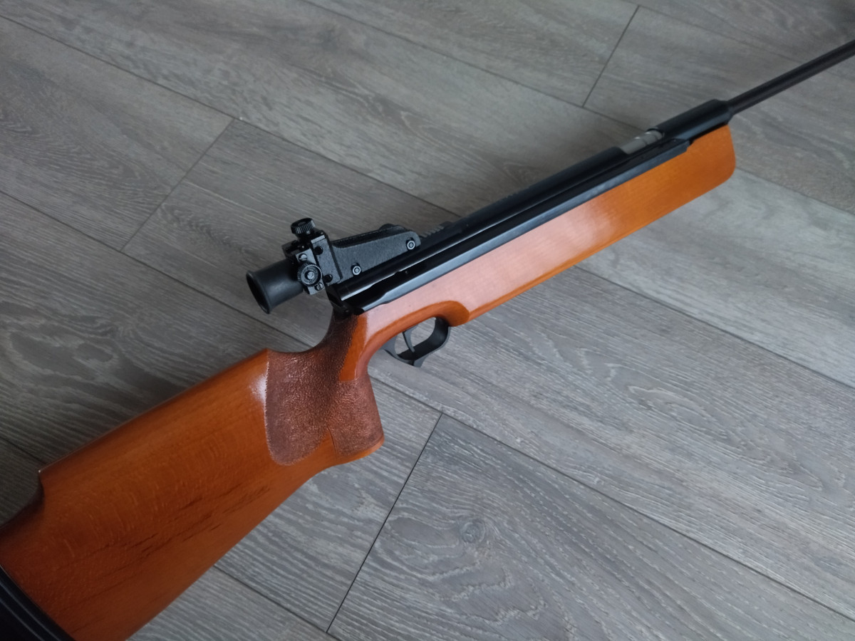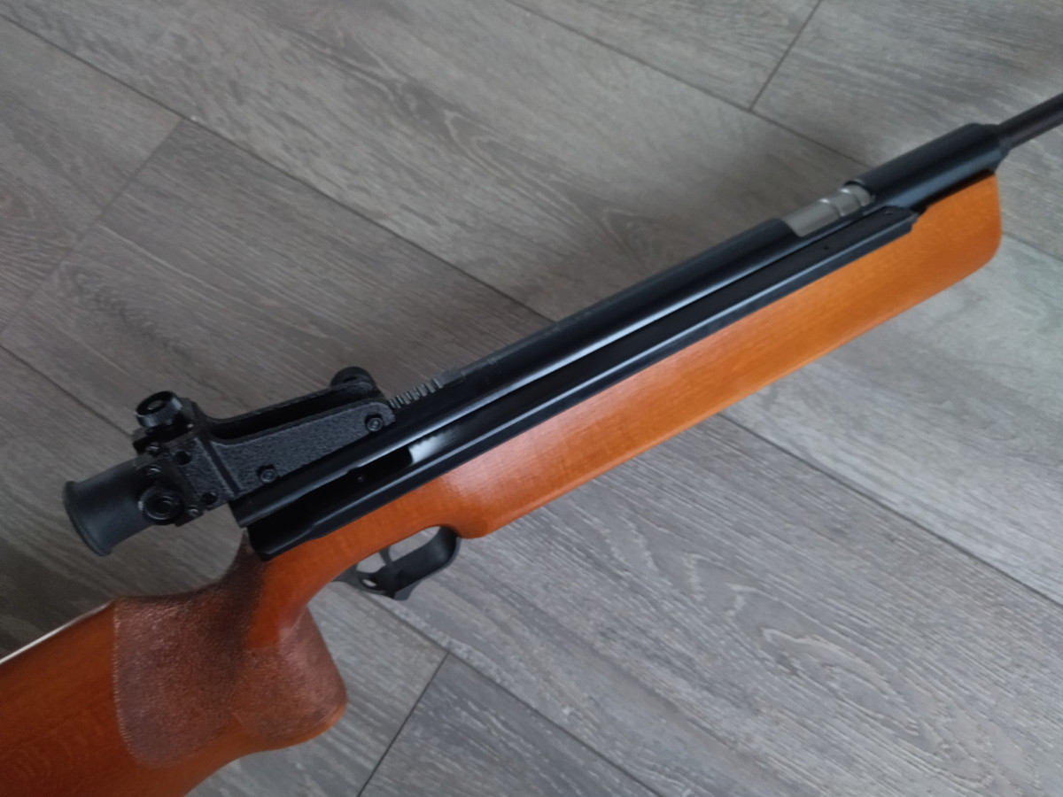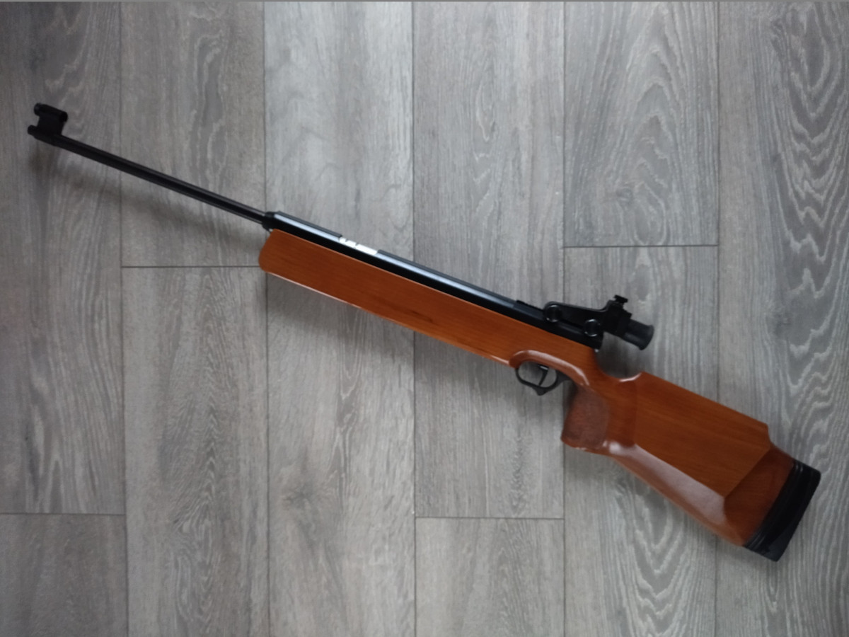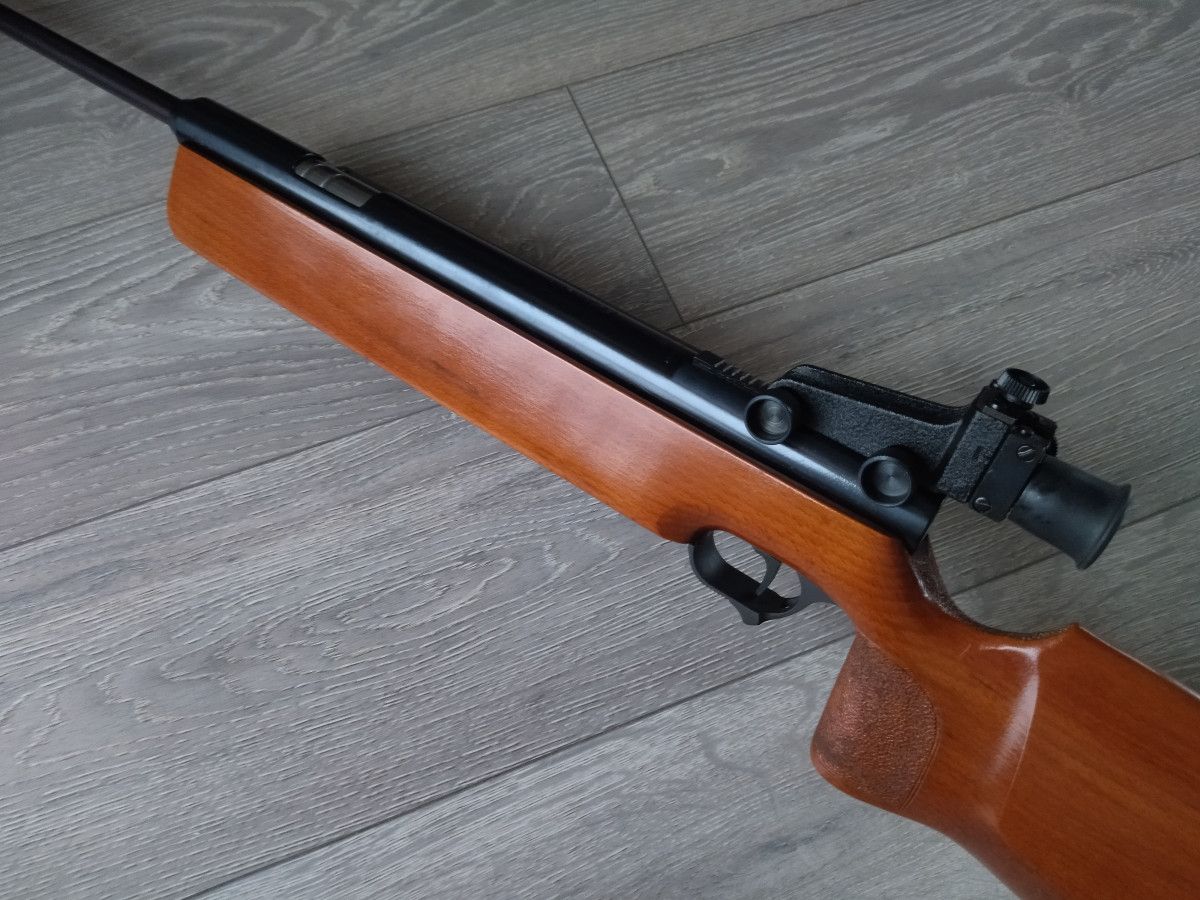 Einzellader Seitenspanner Luftgewehr, mit starrem Lauf und Ladekammer für Diabolo im Kaliber 4.5 mm, Lauf gezogen, Einstellbarer Abzug, Diopter Visierung, Länge 1090 mm, Gewicht ca. 4 Kg. Buchenholz Schaft.