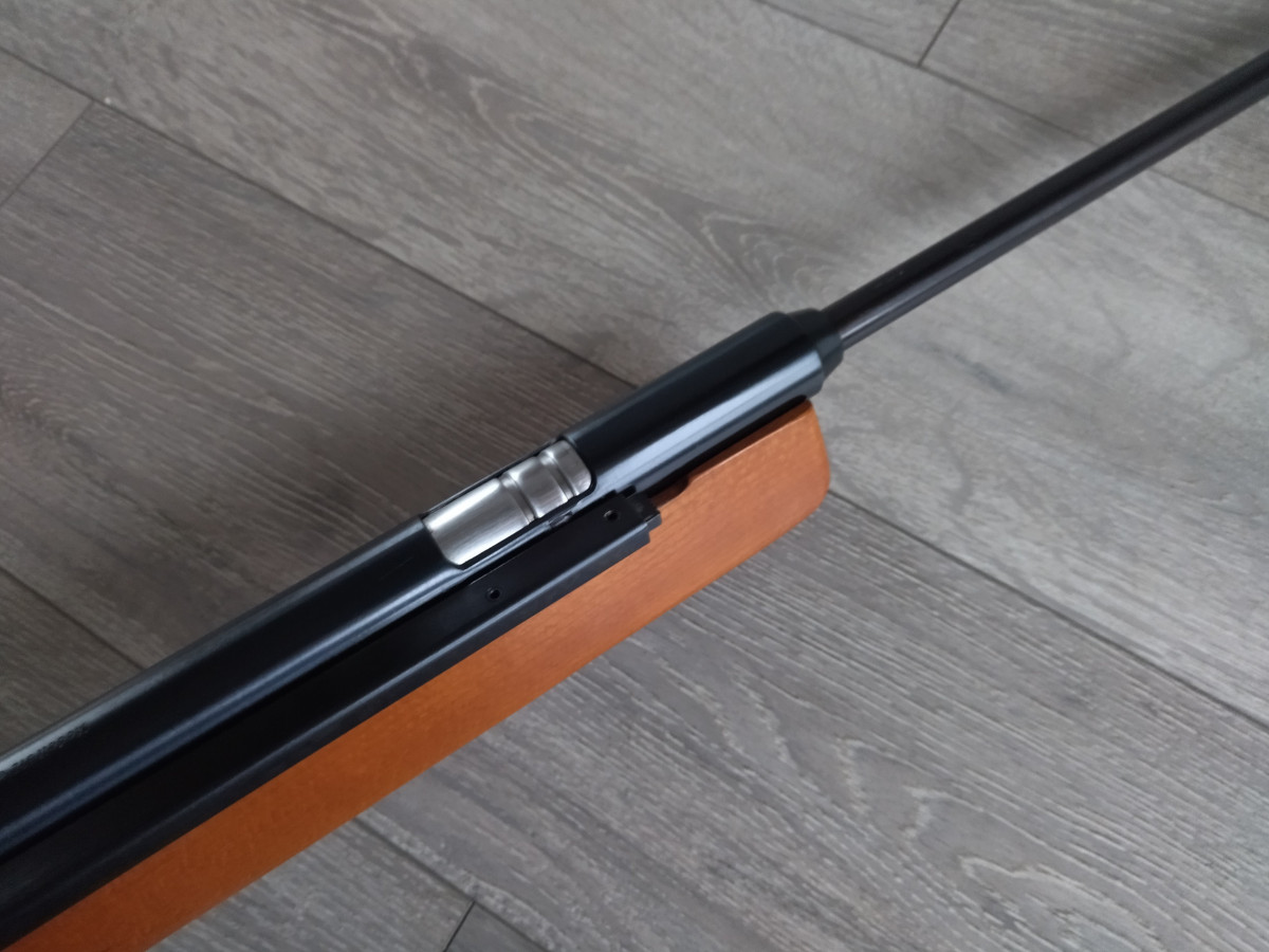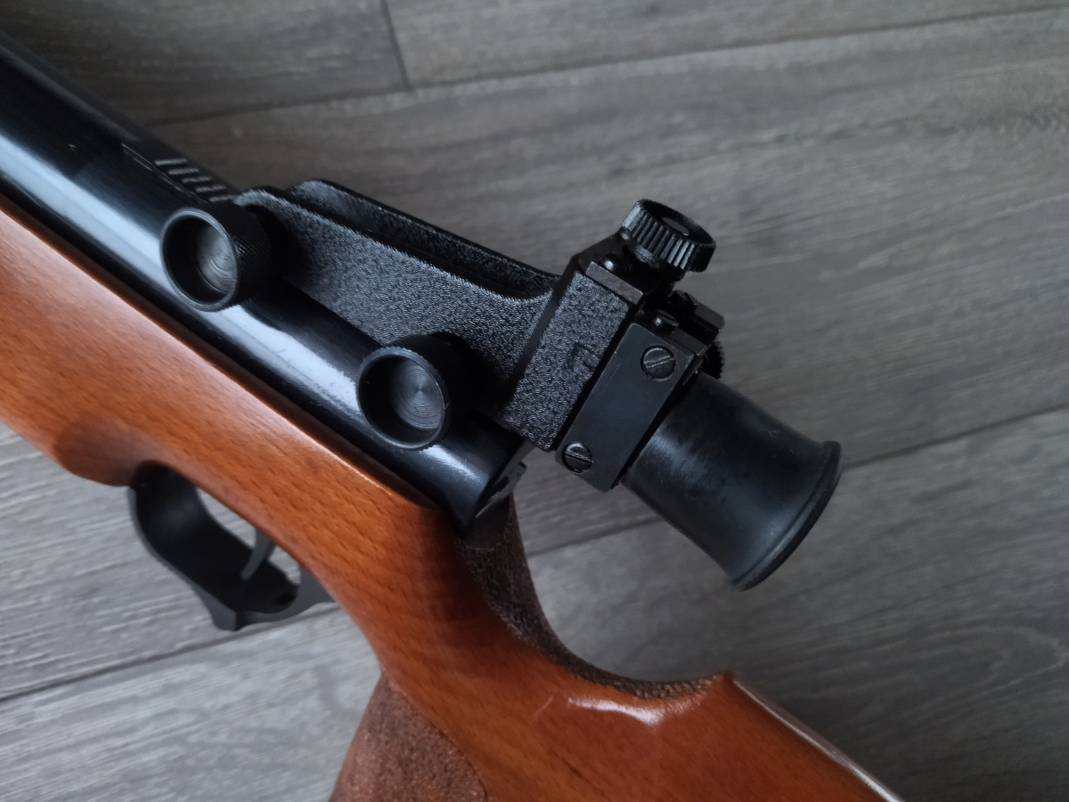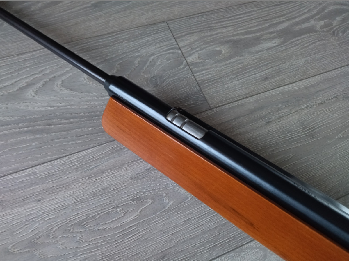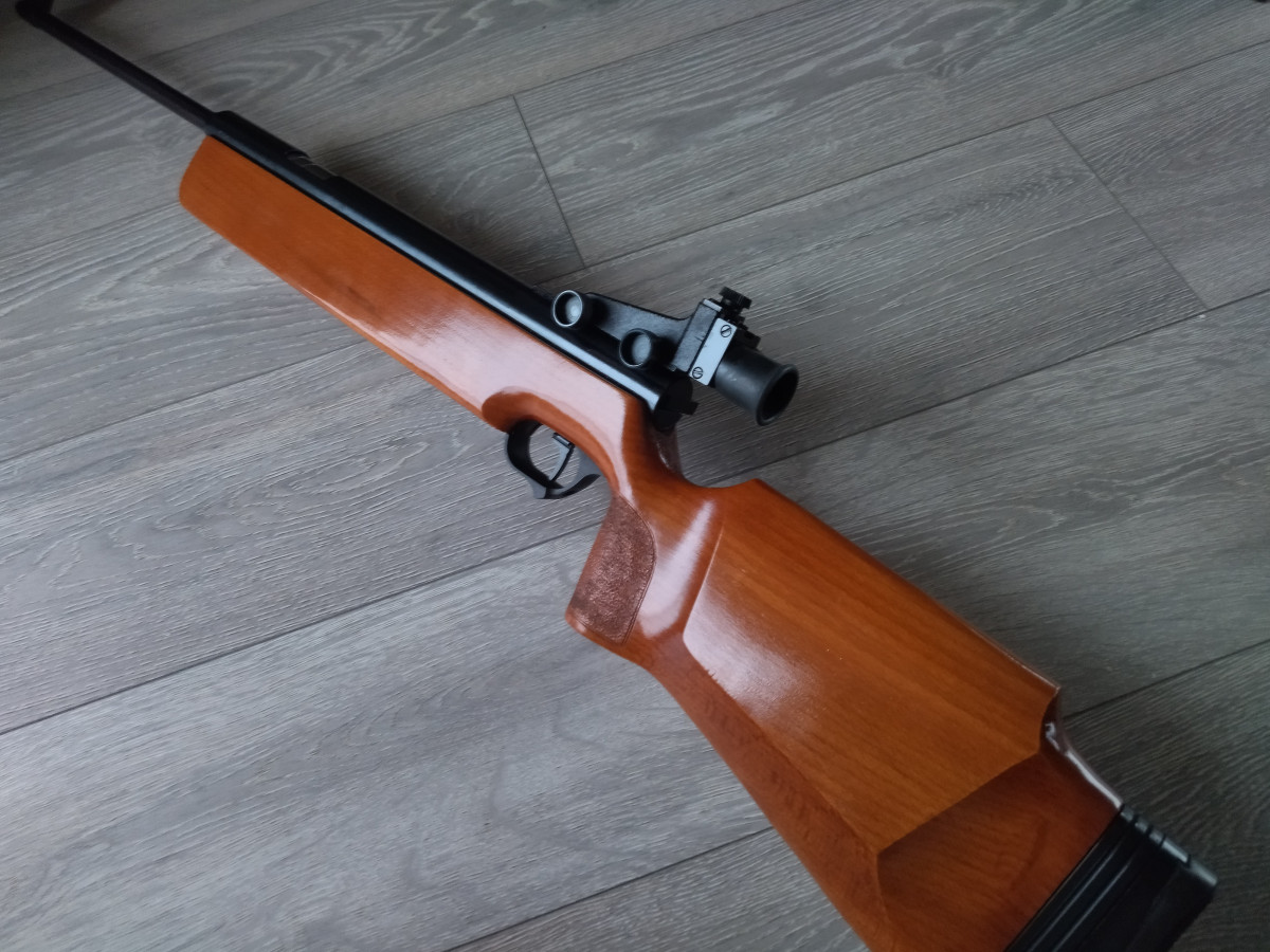 Einzellader Seitenspanner Luftgewehr, mit starrem Lauf und Ladekammer für Diabolo im Kaliber 4.5 mm, Lauf gezogen, Einstellbarer Abzug, Diopter Visierung, Länge 1090 mm, Gewicht ca. 4 Kg. Buchenholz Schaft.