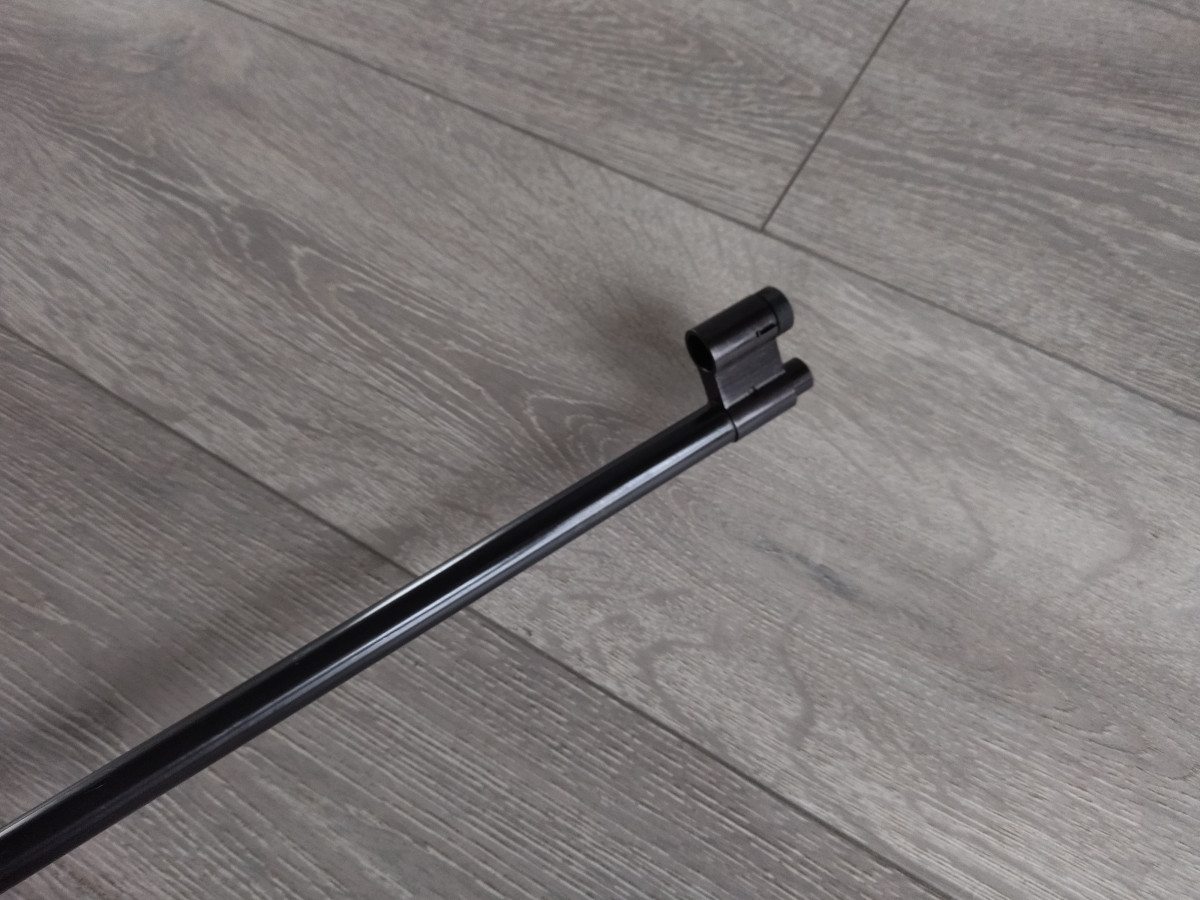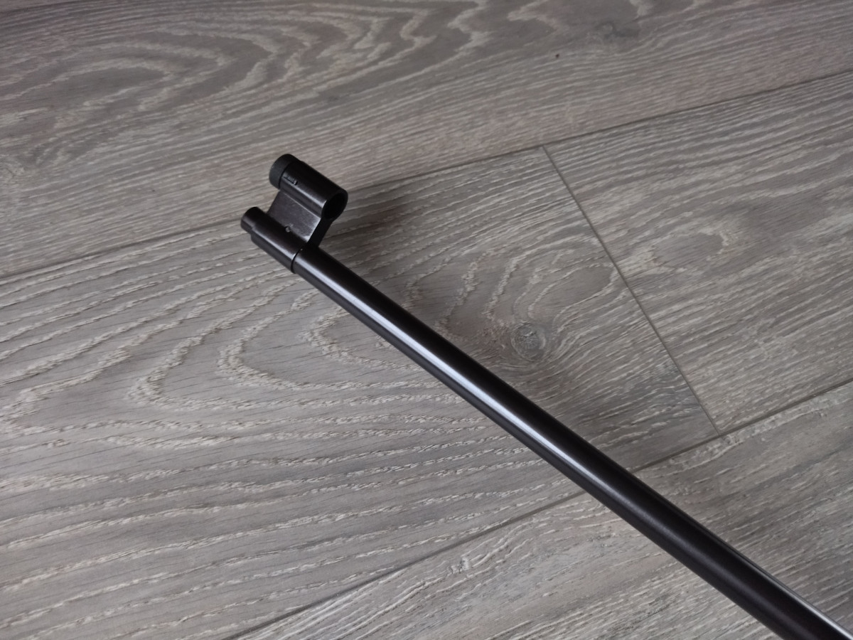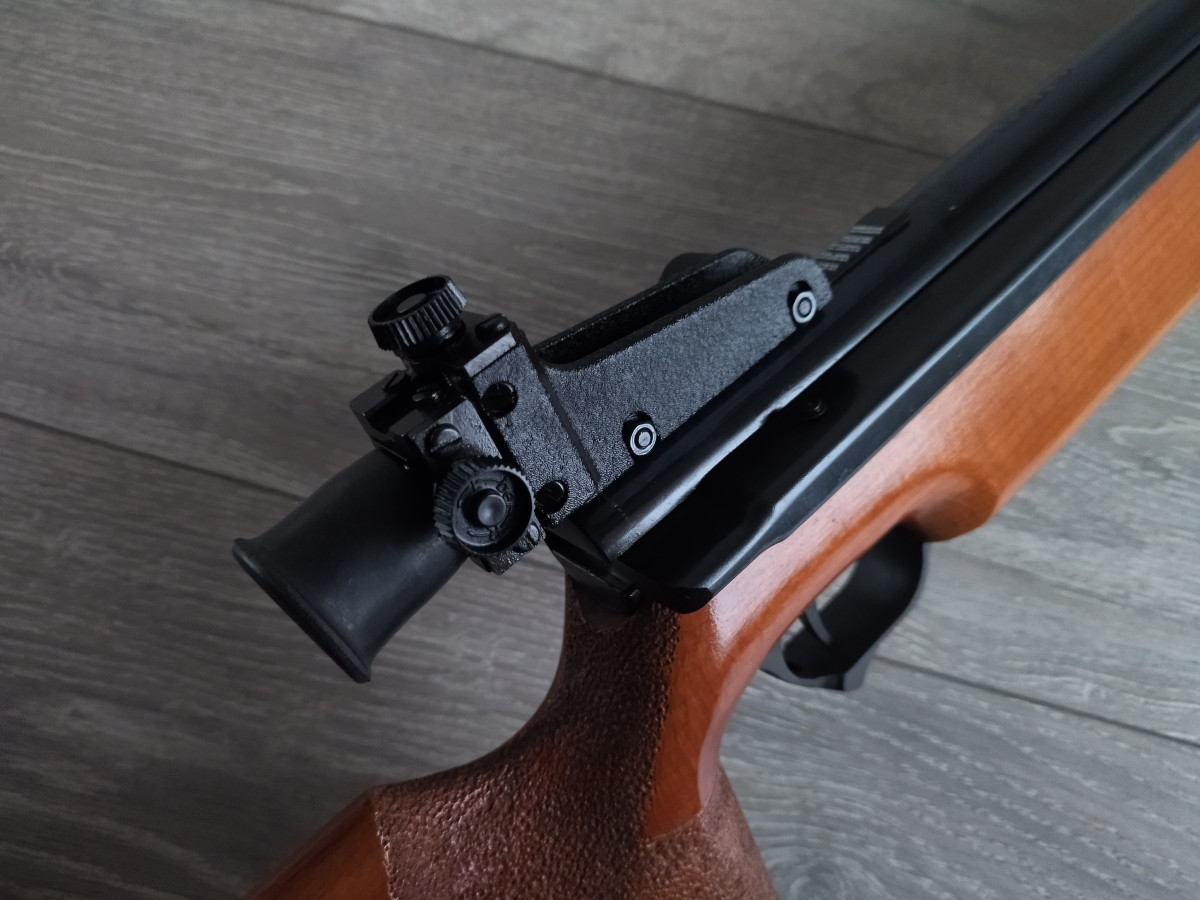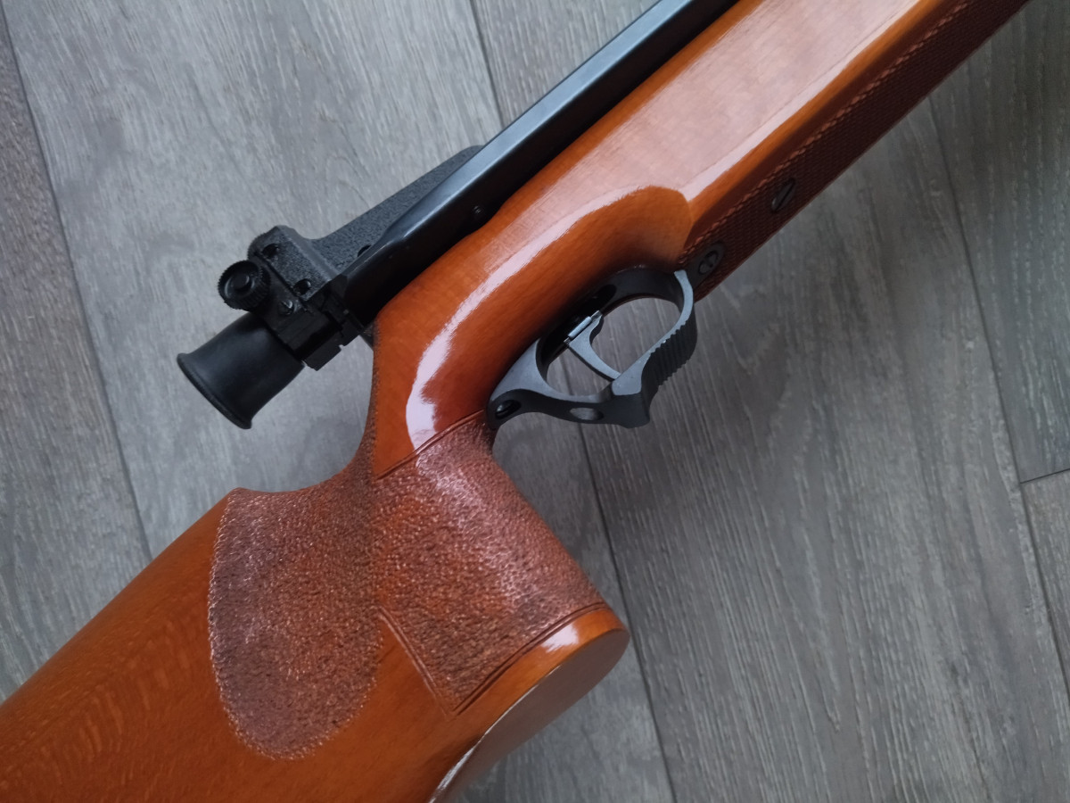 Einzellader Seitenspanner Luftgewehr, mit starrem Lauf und Ladekammer für Diabolo im Kaliber 4.5 mm, Lauf gezogen, Einstellbarer Abzug, Diopter Visierung, Länge 1090 mm, Gewicht ca. 4 Kg. Buchenholz Schaft.