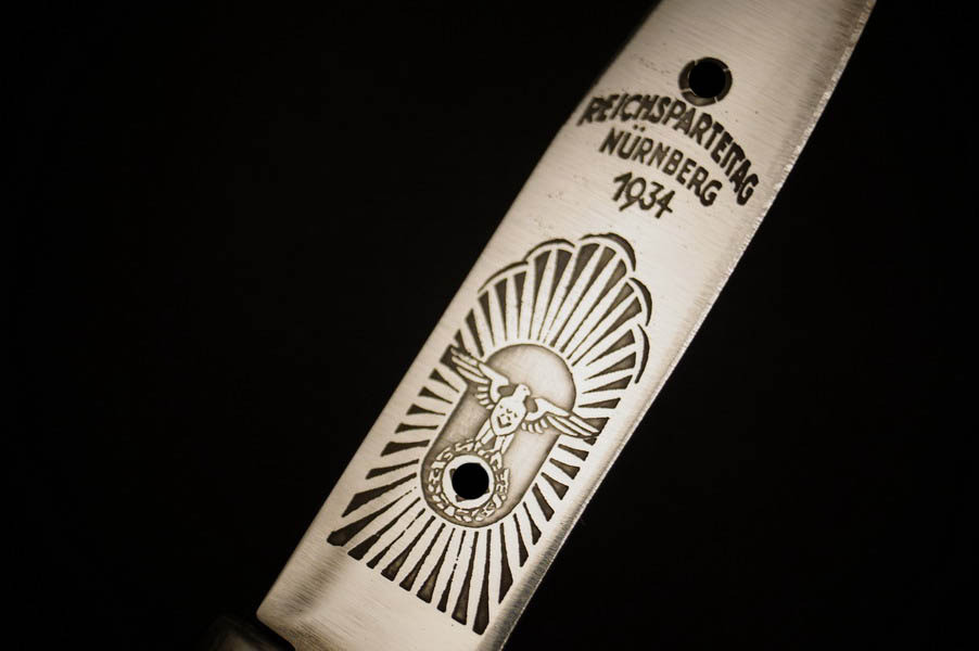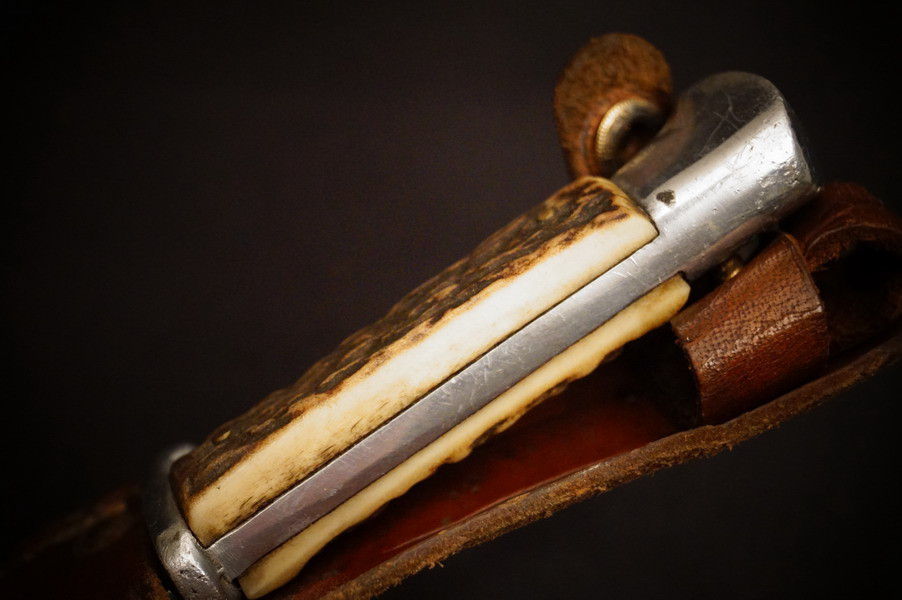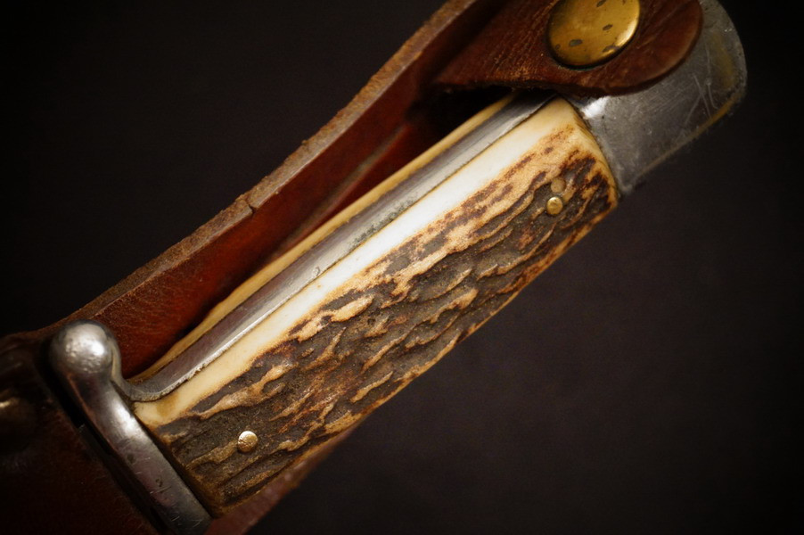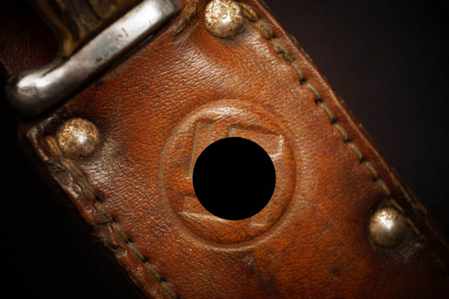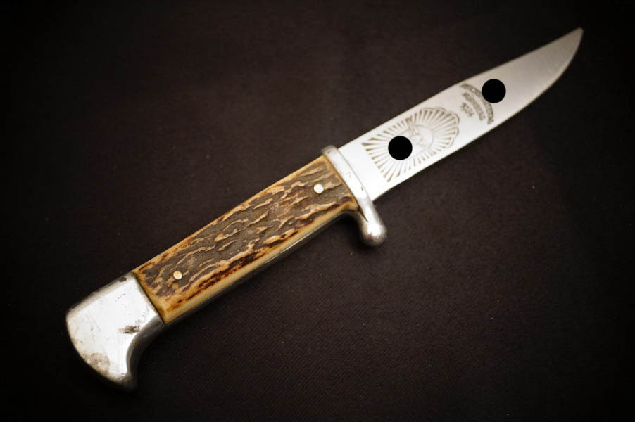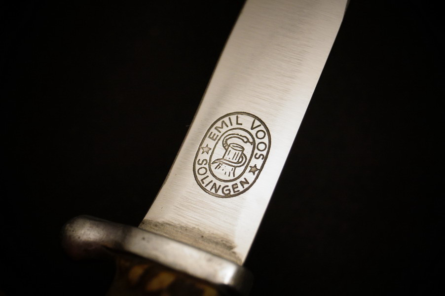 Zustand siehe Bilder. Original. Bilder sind Gegenstand der Beschreibung. Alugefäß mit echtem Hirschhorn. Sehr feine Zierätzung. Klinge noch mit schönem Blauschliff. Lederscheide geprägt mit HK. Sehr selten !