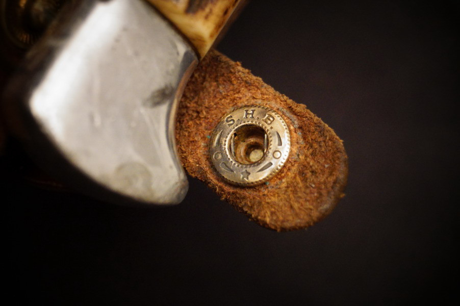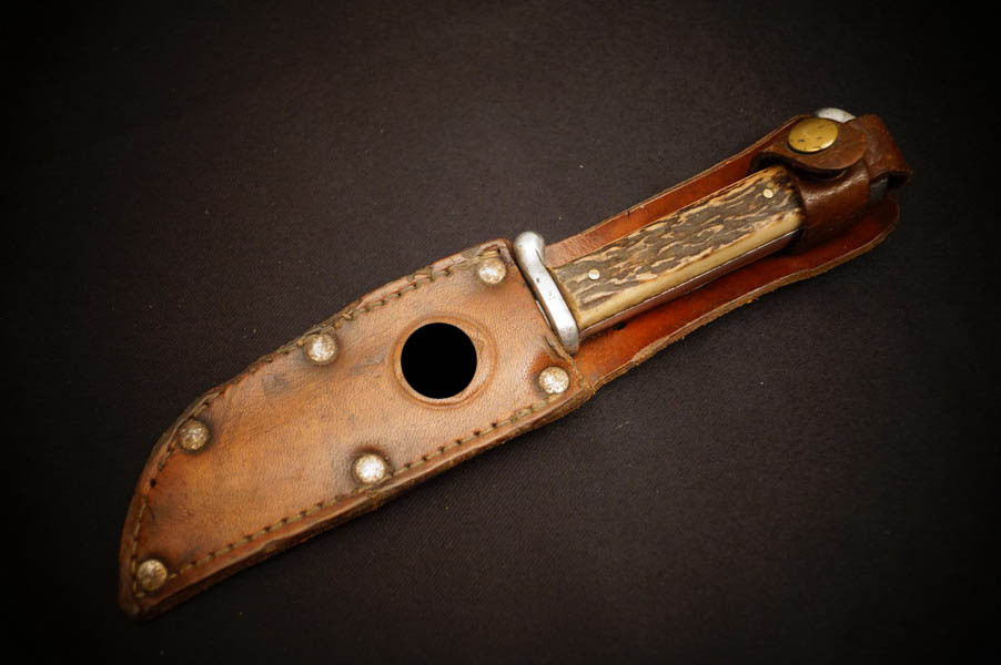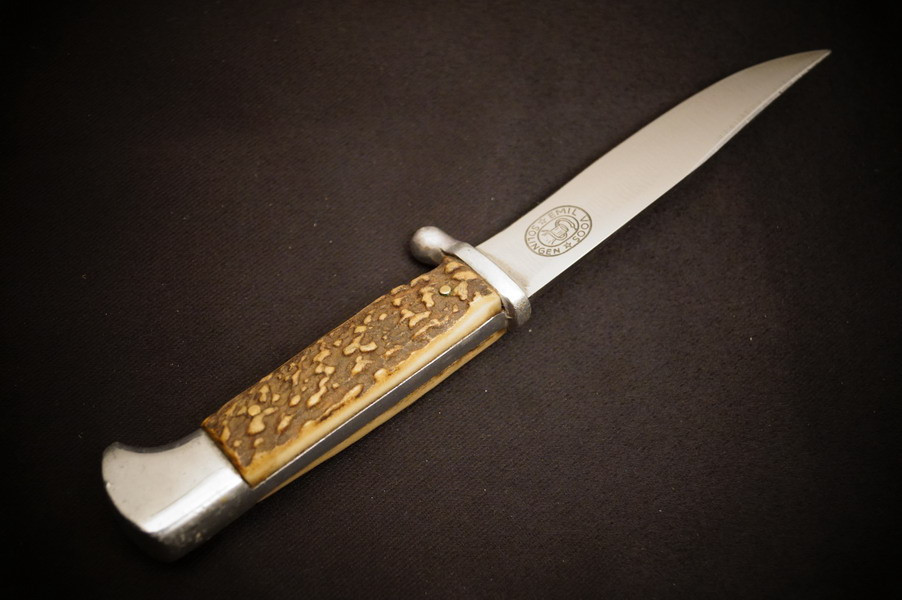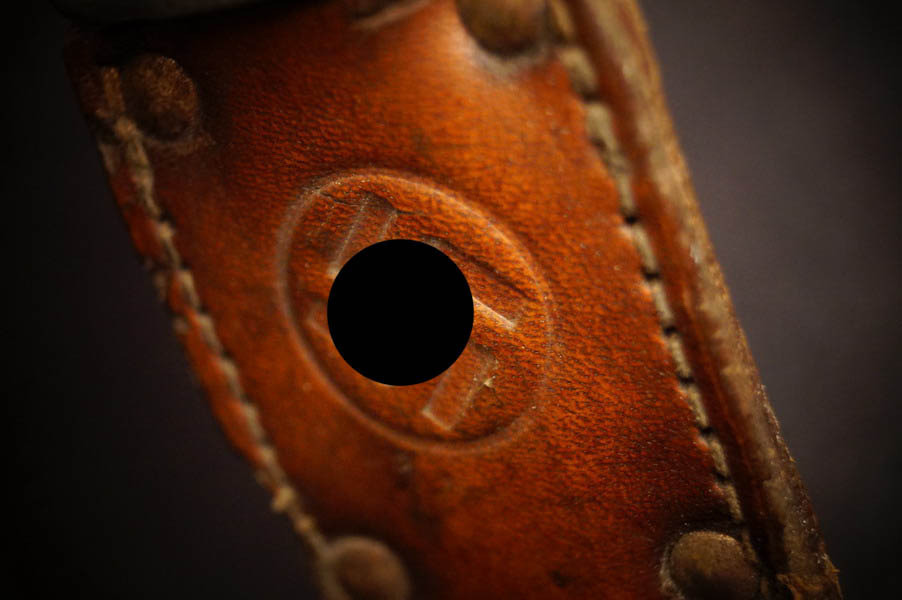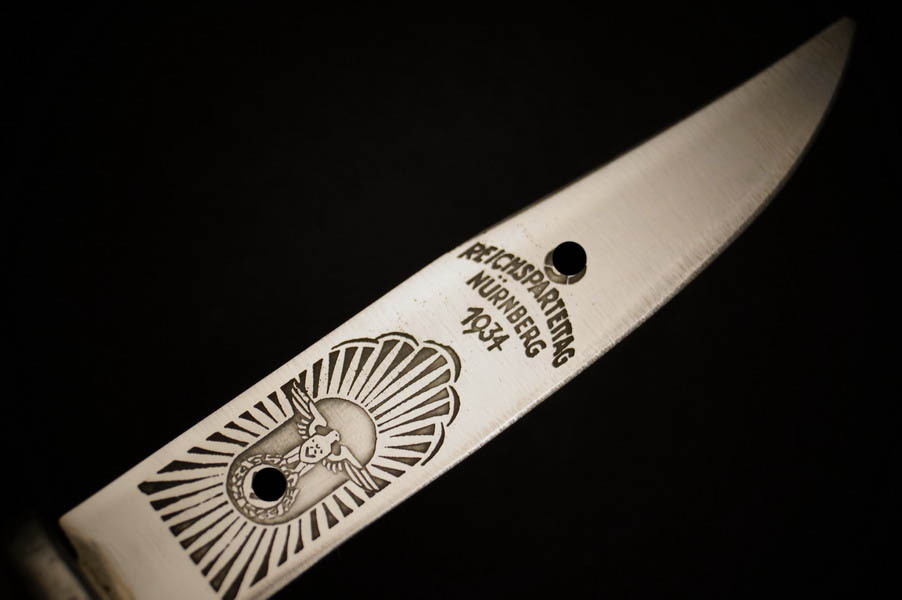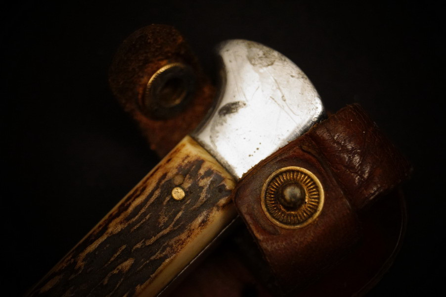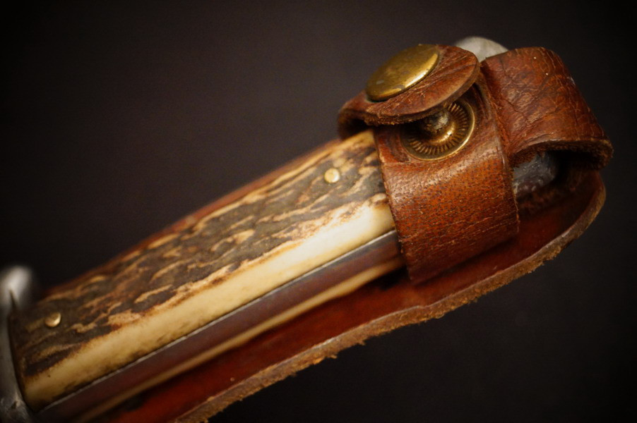 Zustand siehe Bilder. Original. Bilder sind Gegenstand der Beschreibung. Alugefäß mit echtem Hirschhorn. Sehr feine Zierätzung. Klinge noch mit schönem Blauschliff. Lederscheide geprägt mit HK. Sehr selten !