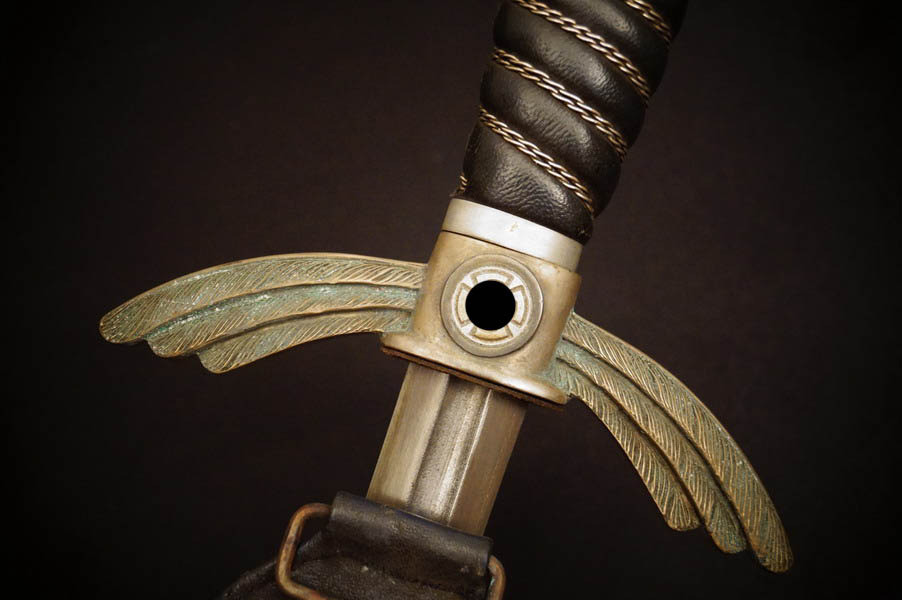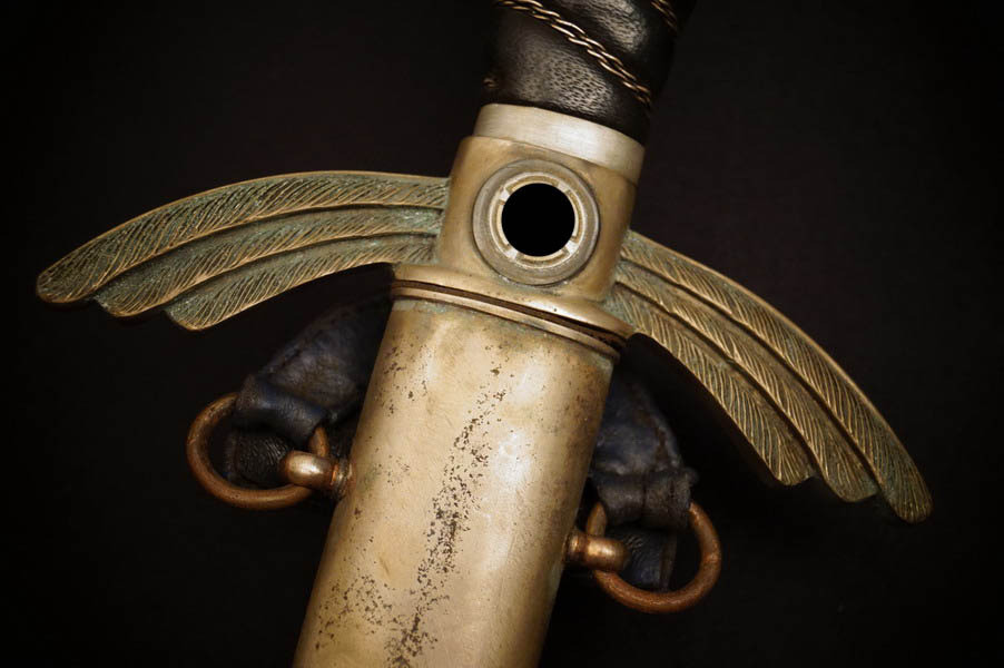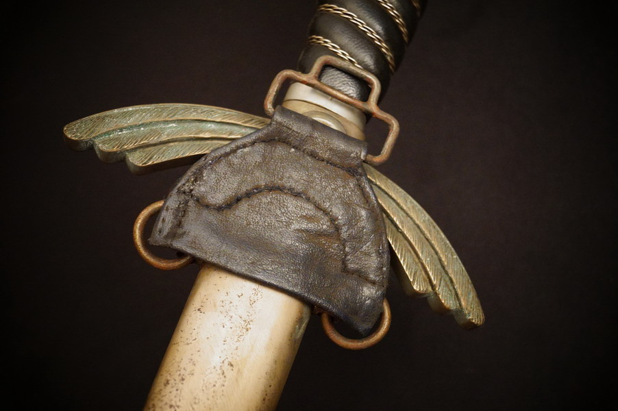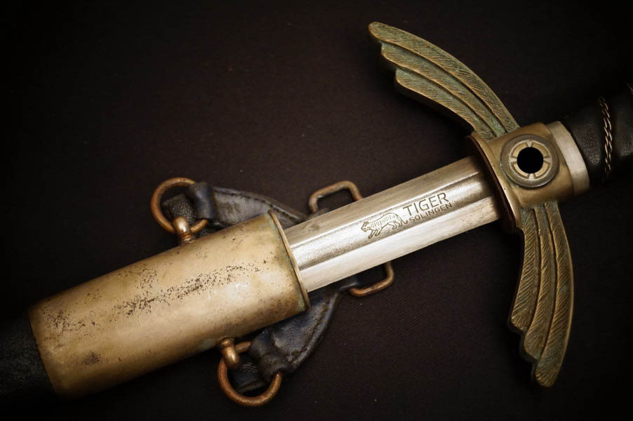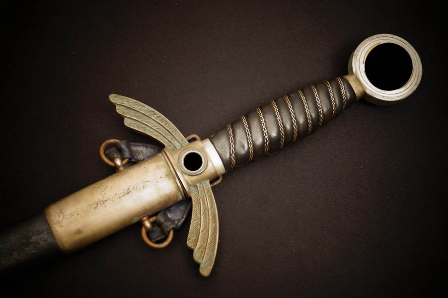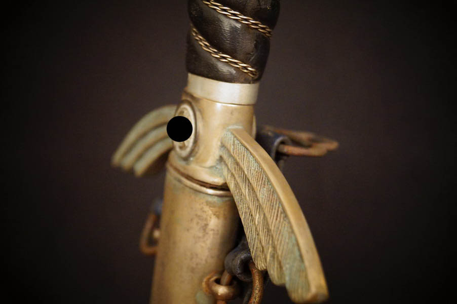 Zustand siehe Bilder. Original. Bilder sind Gegenstand der Beschreibung. Stärker getragen. Parierstange ist aus Neusilber wie auch die Beschläge. Kopf aus Alu. Einlage mit goldenen HKs aus Alu in Parierstange und Knauf.