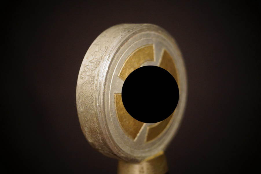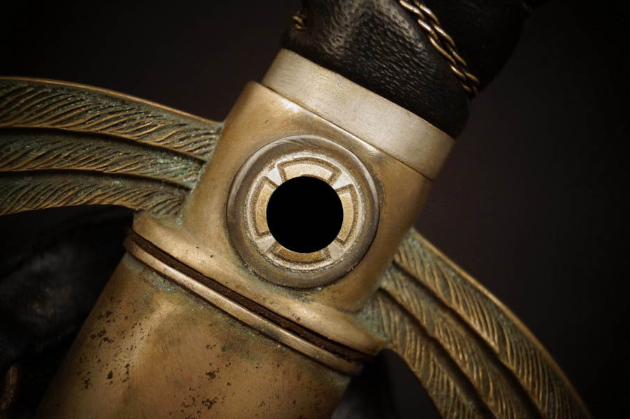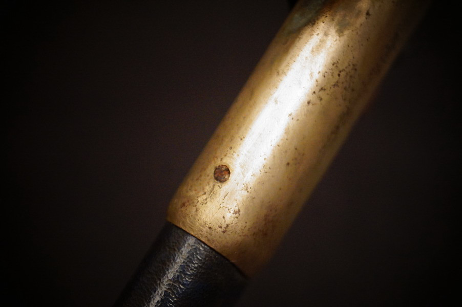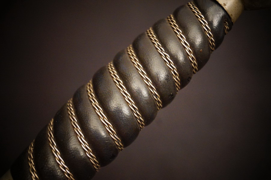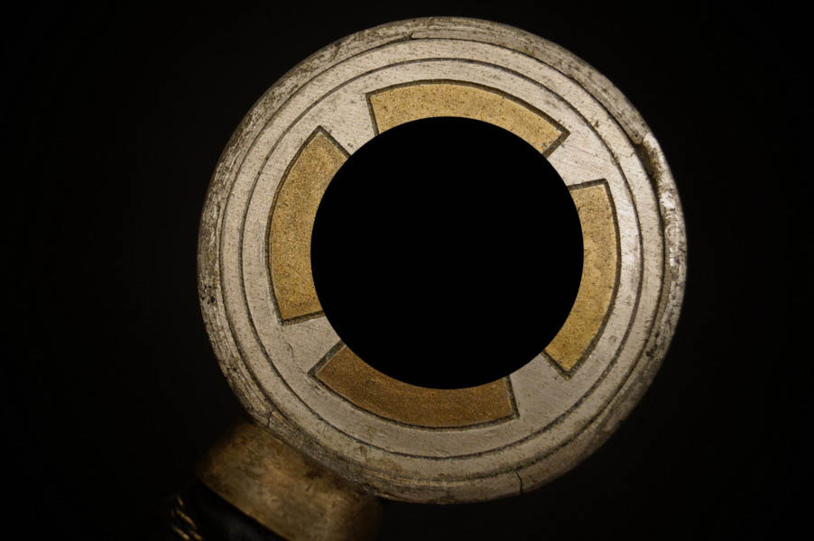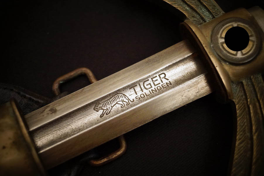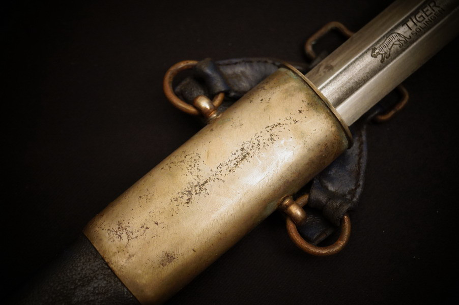 Zustand siehe Bilder. Original. Bilder sind Gegenstand der Beschreibung. Stärker getragen. Parierstange ist aus Neusilber wie auch die Beschläge. Kopf aus Alu. Einlage mit goldenen HKs aus Alu in Parierstange und Knauf.