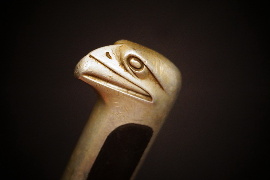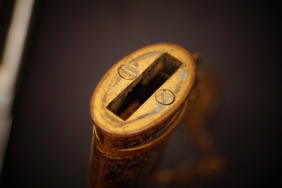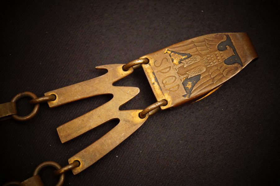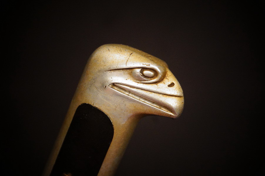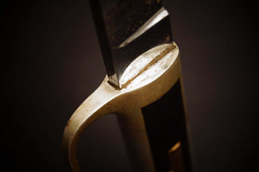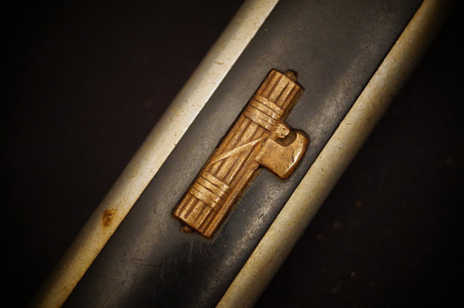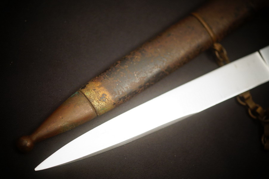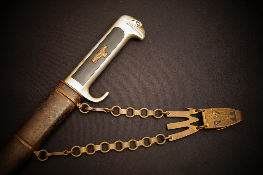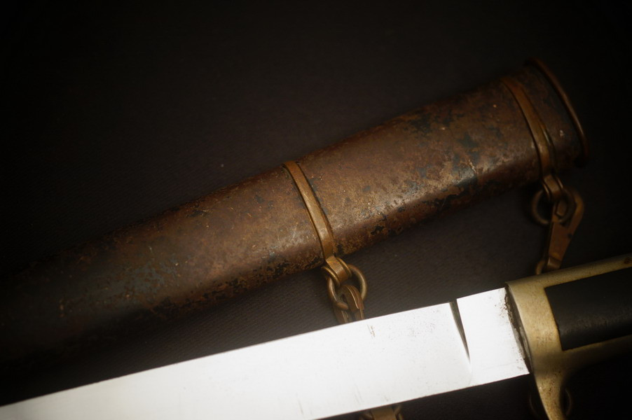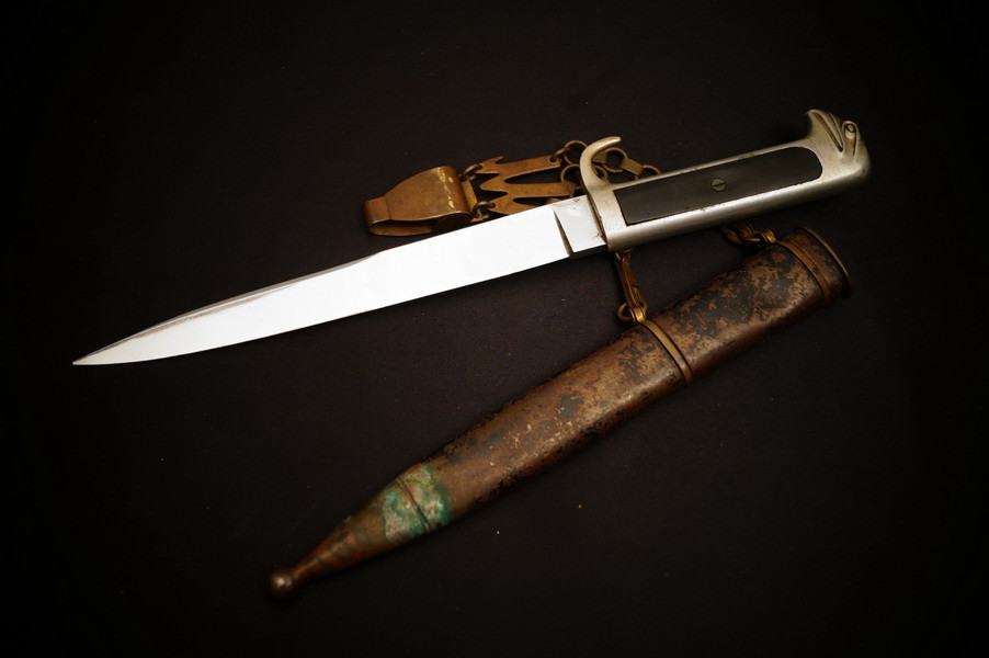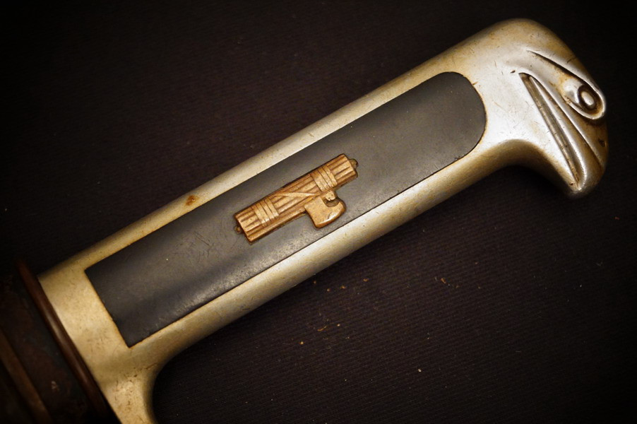 Zustand siehe Bilder. Original. Bilder sind Gegenstand der Beschreibung. Stahlscheide, mehrteilig mit Bronzebeschlagteilen. Keilformklinge mit vollständiger Vernickelung und aus Stahl. Griffstück aus Alu. Extrem selten !!!