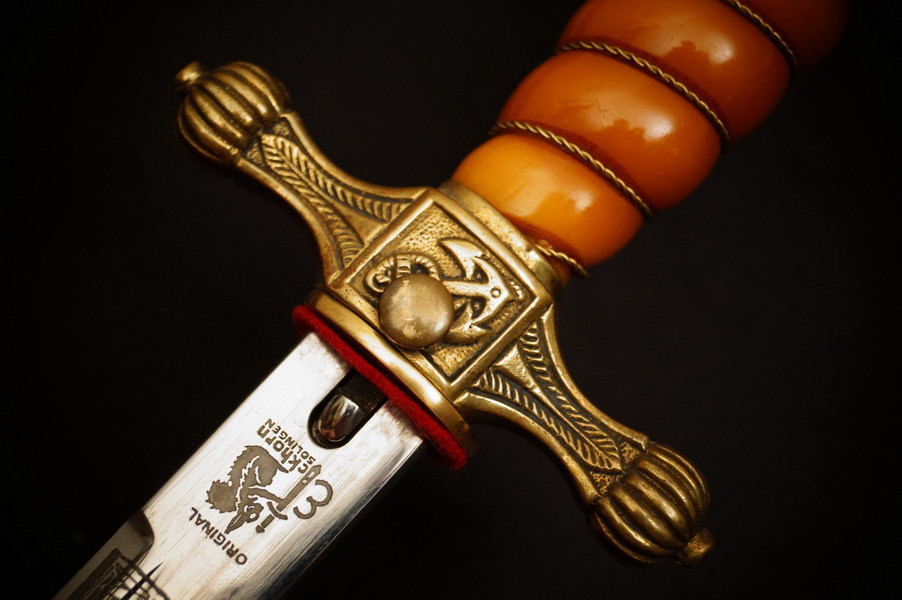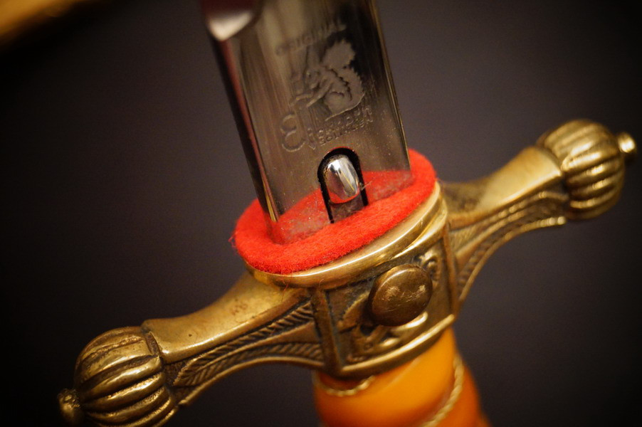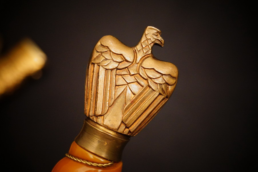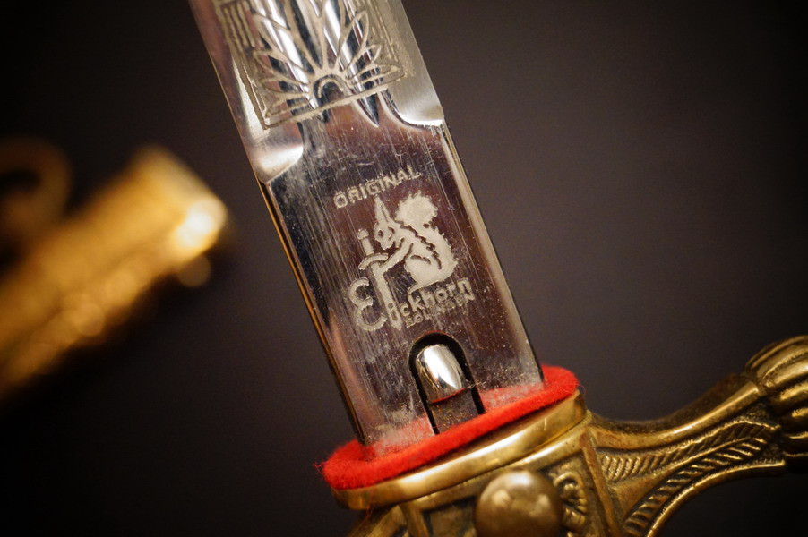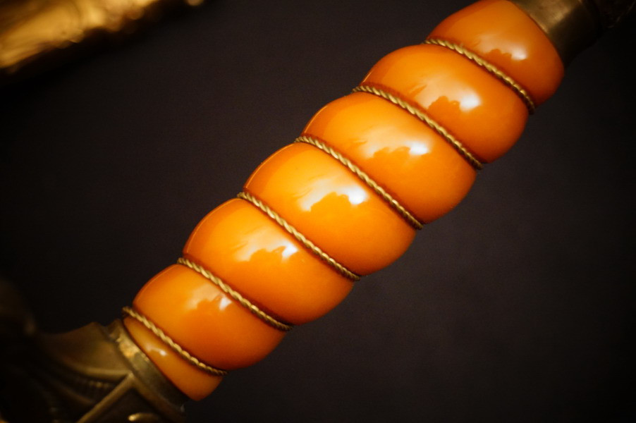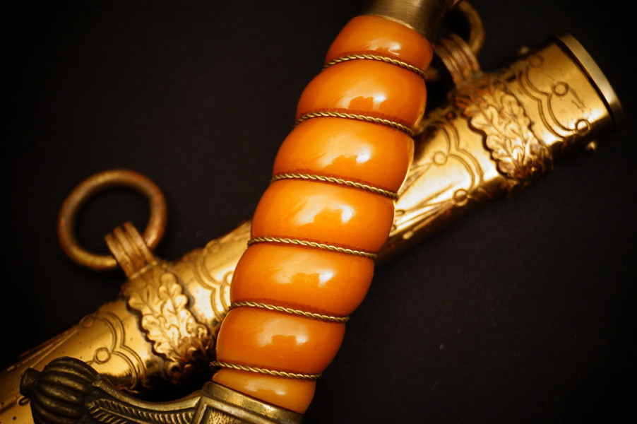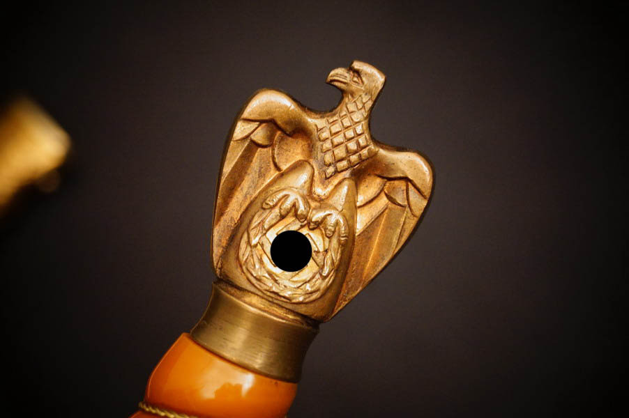 Zustand siehe Bilder. Original. Bilder sind Gegenstand der Beschreibung. Prunkstück mit Zierätzung und teils noch dem Schutzlack auf den Teilen. Griffstück ohne Schäden - scheint wie Bernstein und ist hochglänzend. Wir wohl Trolon sein aber echt super. Matching in allen Teilen.