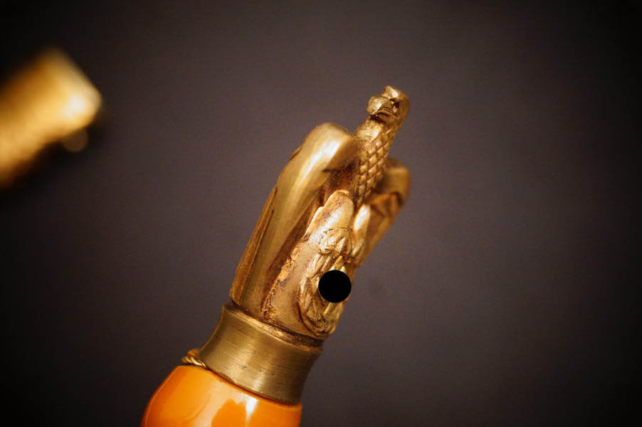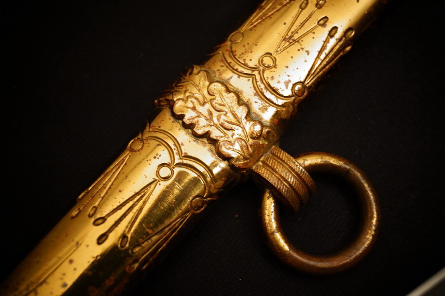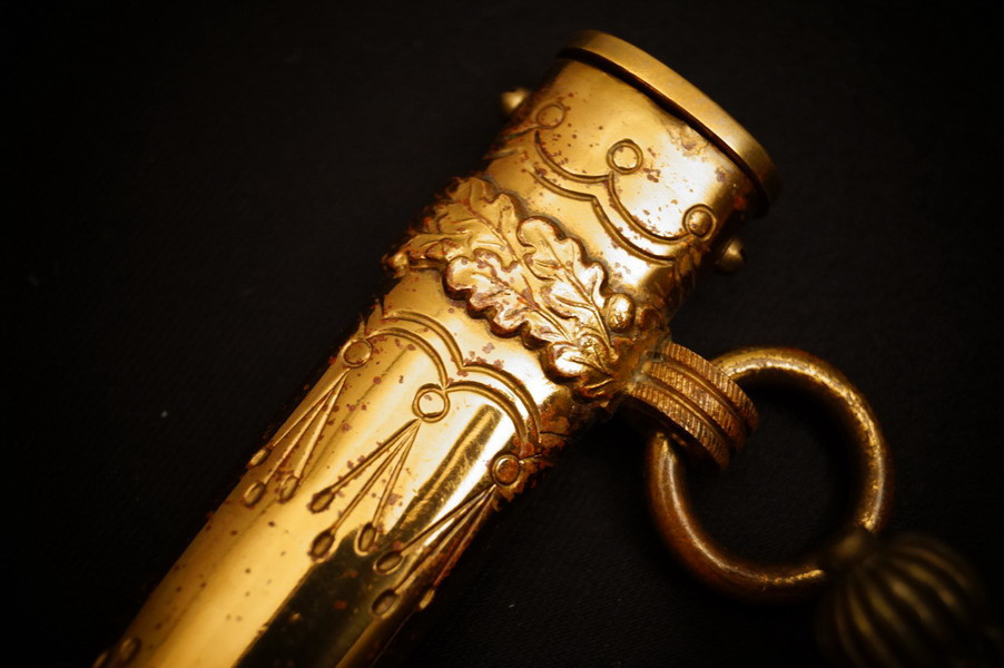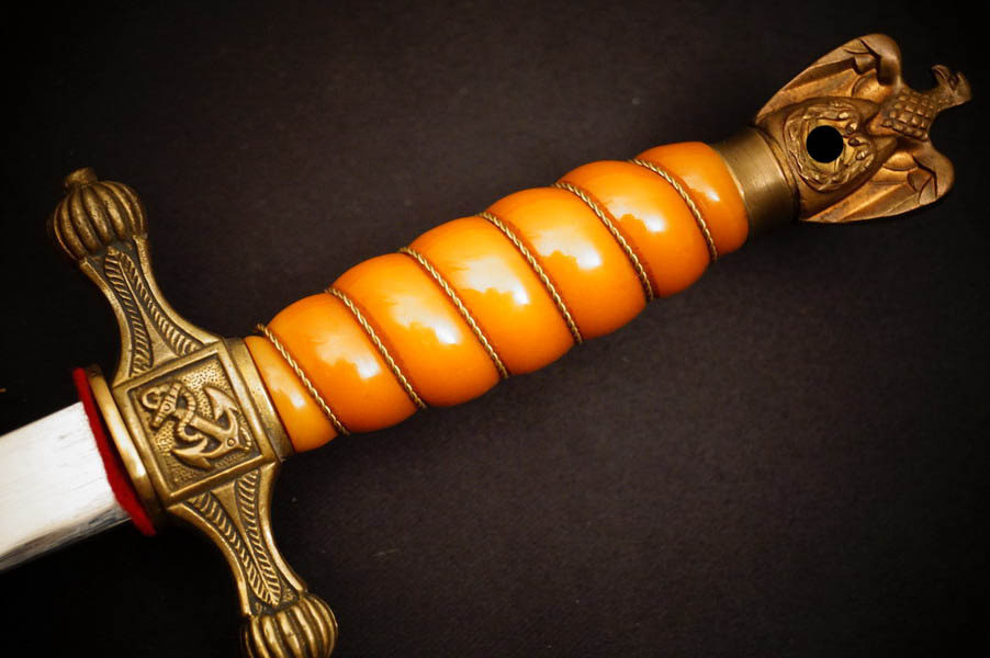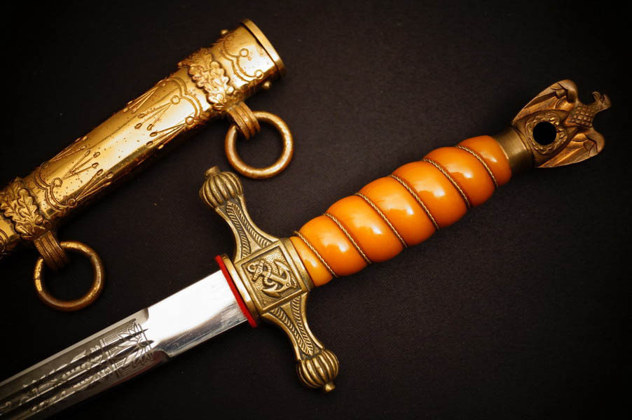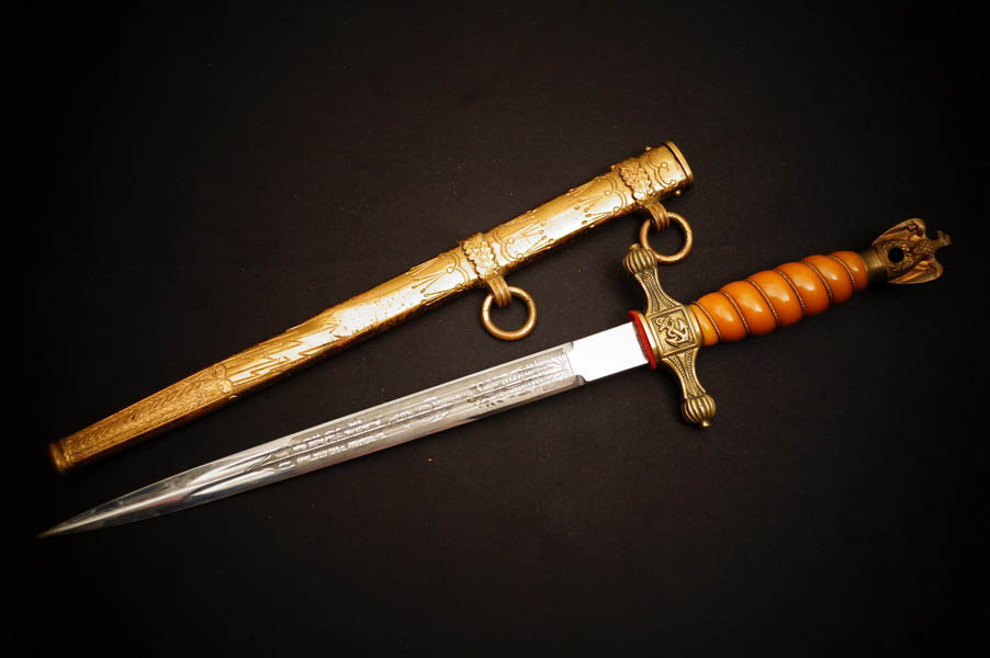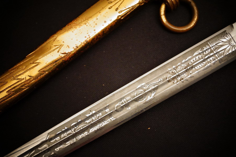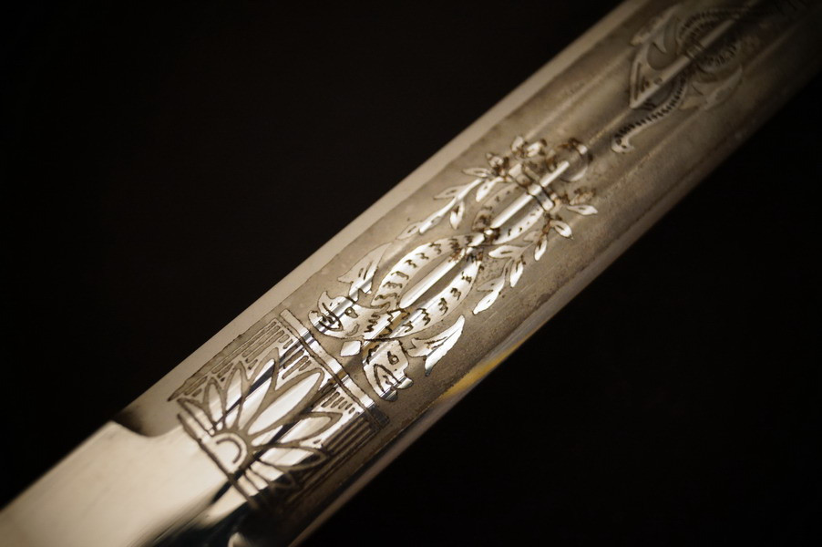 Zustand siehe Bilder. Original. Bilder sind Gegenstand der Beschreibung. Prunkstück mit Zierätzung und teils noch dem Schutzlack auf den Teilen. Griffstück ohne Schäden - scheint wie Bernstein und ist hochglänzend. Wir wohl Trolon sein aber echt super. Matching in allen Teilen.