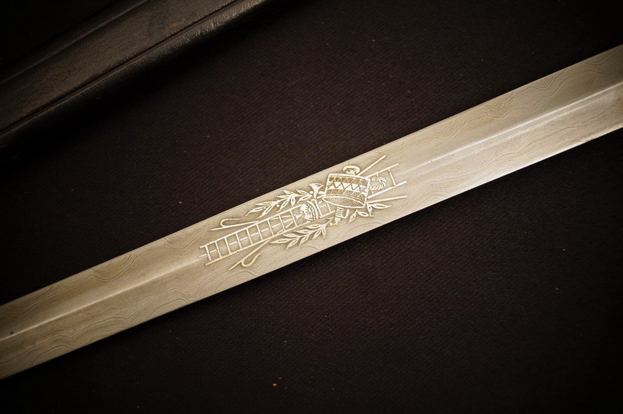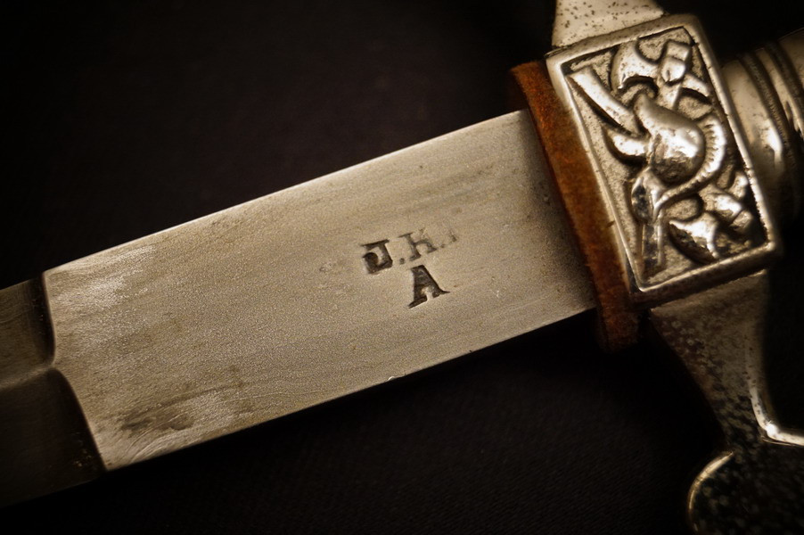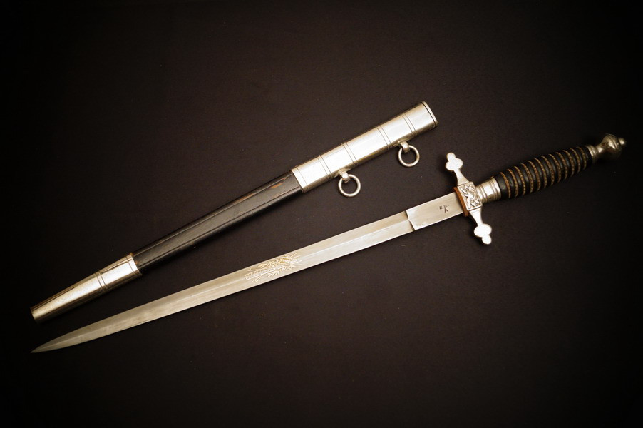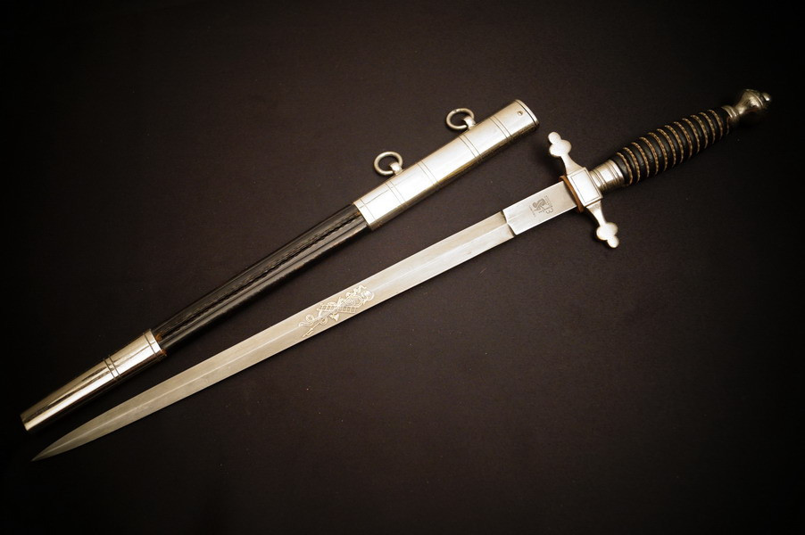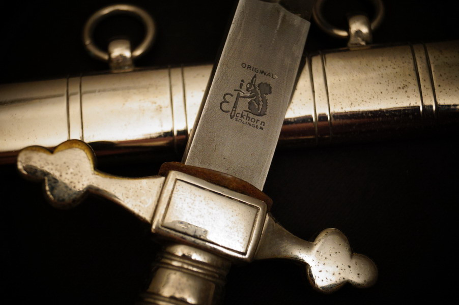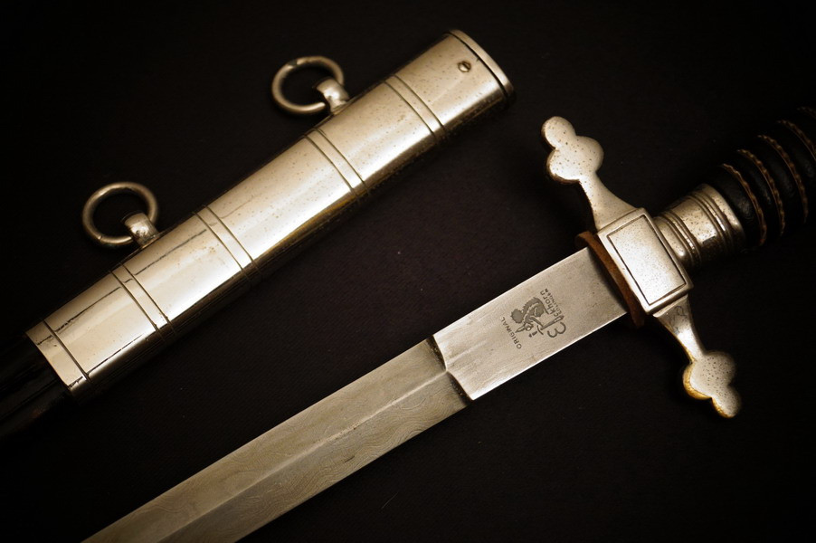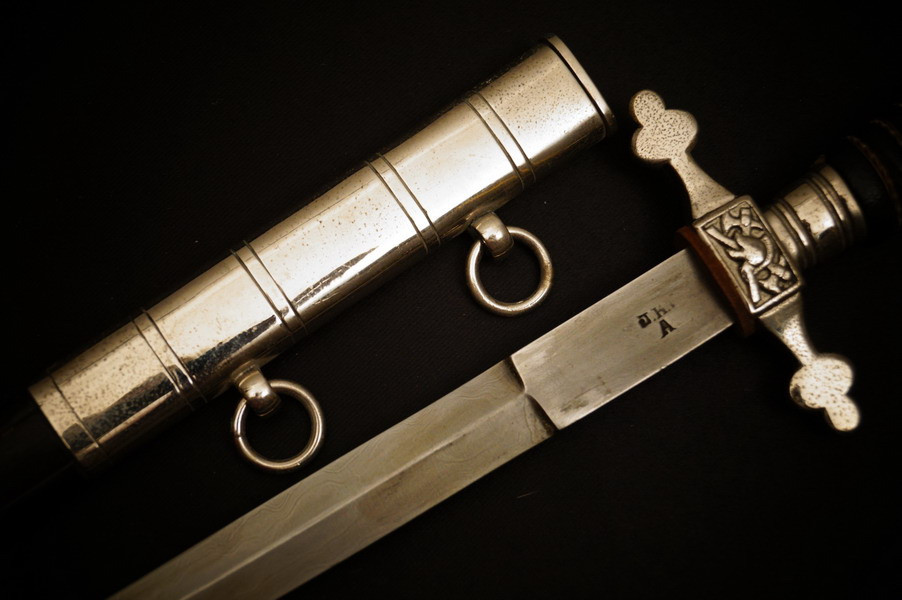 Zustand siehe Bilder. Original. Bilder sind Gegenstand der Beschreibung. Echter Damast Stahl ! Griffstück aus Holz. Lederscheide. Alle Beschlagteile vernickelt und teils etwas angelaufen. Klinge mit erhabener Vergoldung und mit Schmied Stempel. Selten !