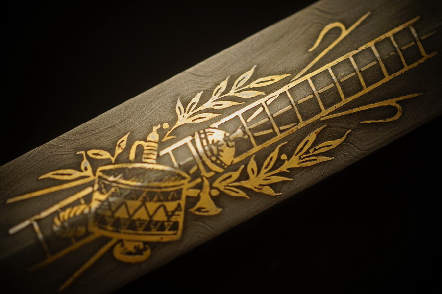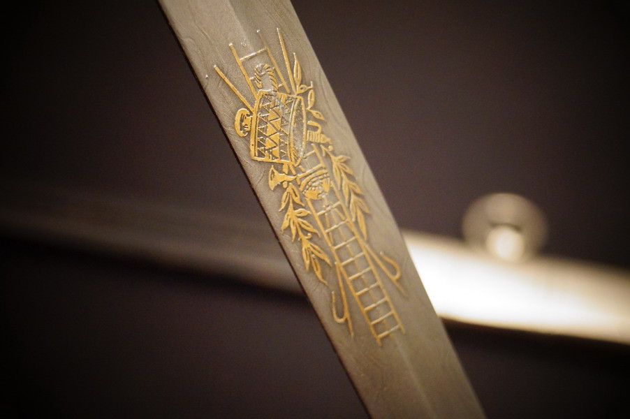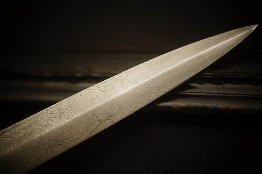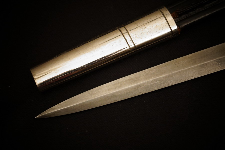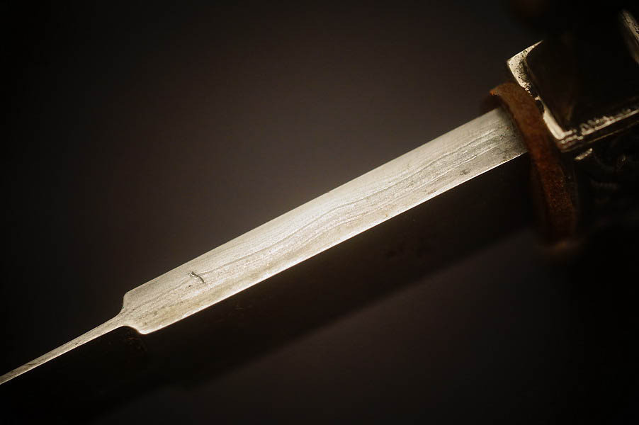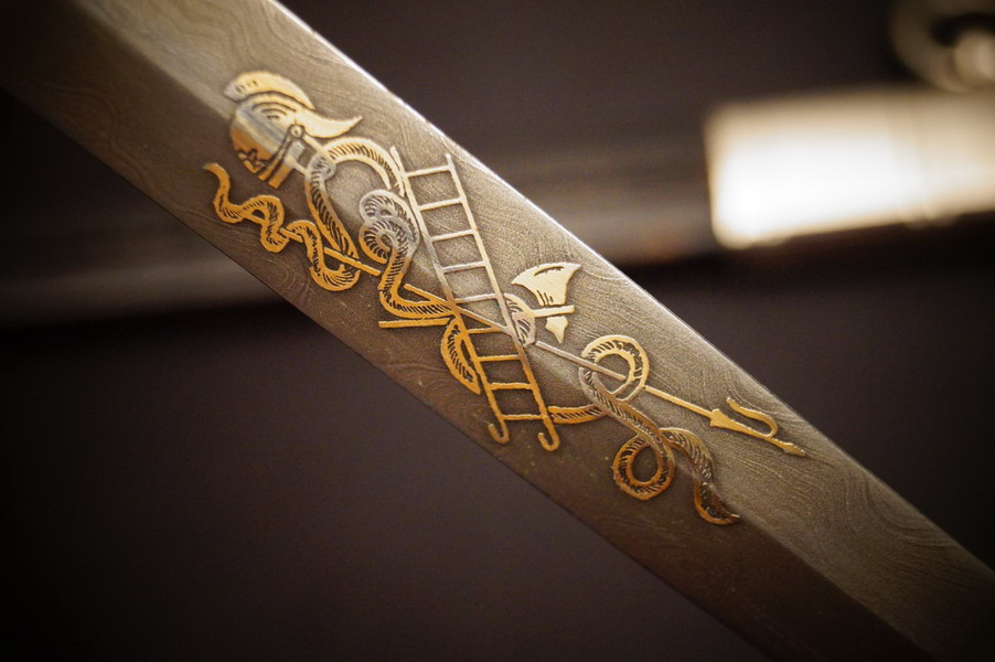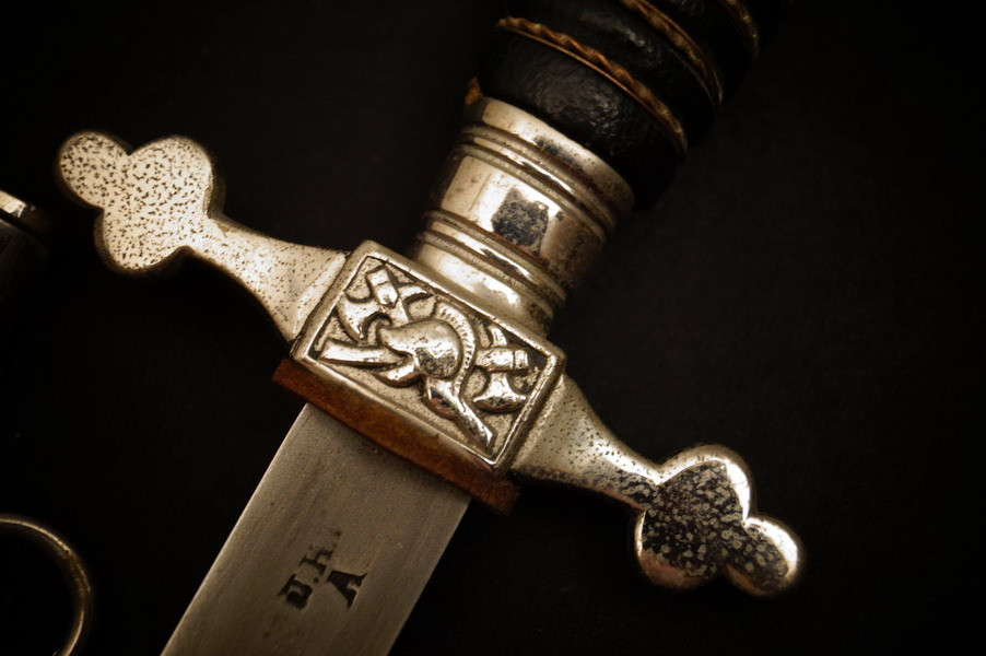Zustand siehe Bilder. Original. Bilder sind Gegenstand der Beschreibung. Echter Damast Stahl ! Griffstück aus Holz. Lederscheide. Alle Beschlagteile vernickelt und teils etwas angelaufen. Klinge mit erhabener Vergoldung und mit Schmied Stempel. Selten !