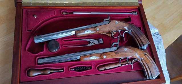 Ich biete hier eine verglaste Schatulle mit 2 Duellpistolen mit Zubehör, Made in Spain. Die Pistolen sind uneingeschränkt schussfähig, mit gül. Beschuss. Die Läufe haben sg. Mikrozüge, und wurden bis jetzt nie geschossen. Beide Pistolen haben polierte, unbehandelte Oberfläche, vermutlich Edelstahl (ohne gewähr) beide haben fortlaufende Seriennummer. Die Schatulle(Vitrine) hat an der Unterseite 2 Aufhänge-Ösen. Ich habe keine Schäden, Rost, Risse, gefunden, alles ist in Topzustand. Ein super schönes Geschenk zum Weihnachten! Hier ab 1 € Abholung bevorzugt, sonst Versand mit DHL. Bitte Altersnachweis nicht vergessen, wenn Sie kein ID Egun-er seid. Privatverkauf.