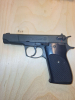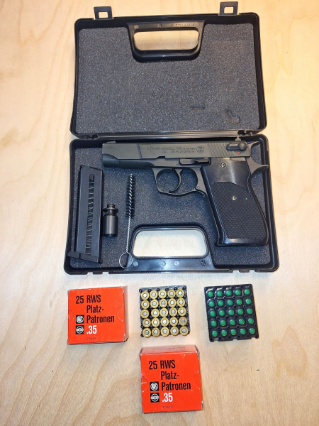 Sie bieten auf eine robuste alte Selbstladepistole Röhm Mod.735 W.-Germany im Kal. .35 Platzpatrone. Die Ausführung der Pistole ist in Schwarz mit Kunststoffgriffschalen. Der PTB-Stempel 482. Angeboten zur Auktion wird die Pistole mit Zubehör im Kunstoffer. Mit einem zusätzlichem Ersatzmagazin, Abschußbecher,Reinigungsbürste. Und 2 Stück Schachteln mit der alten RWS Platzpatronen Munition im Kaliber .35 mit 50 Schuß. Wie auf den Fotos zu sehen. Die Trockenfunktion der Pistole ist gegeben. Die Pistole hat Gebrauchsspuren und der Zustand ist auf den Fotos zu sehen. Die Fotos sind Bestandteil der Auktion. Der Erwerb ist für Personen ab 18 Jahren frei.