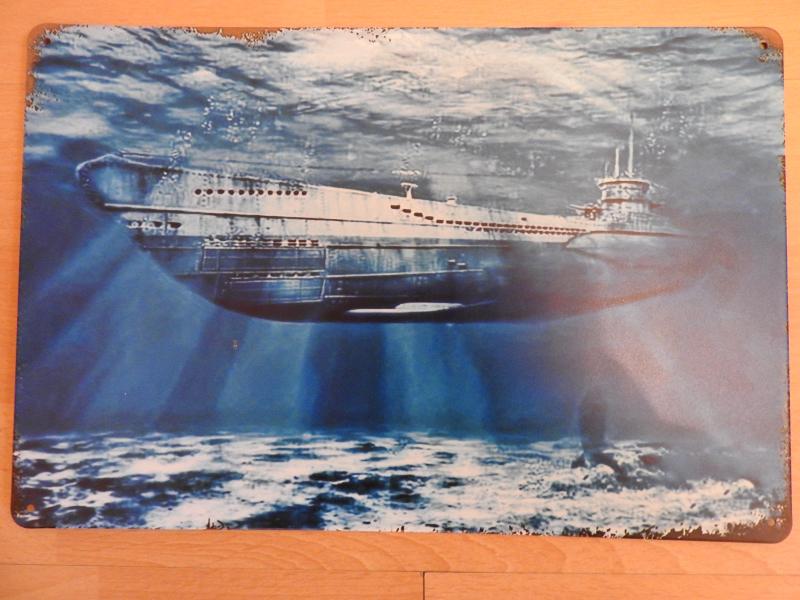 Angeboten wird ein Blech-Dekorations-Werbeschild mit der Unterwasserabbildung eines U-Bootes Typ VII. Das Schild hat die Maße von 20 x 30 cm, ist an den Ecken abgerundet und hat Bohrungen zur Befestigung. Alter und Herkunft sind mir unbekannt. Herstellung des Schildes wahrscheinlich im Siebdruckverfahren.