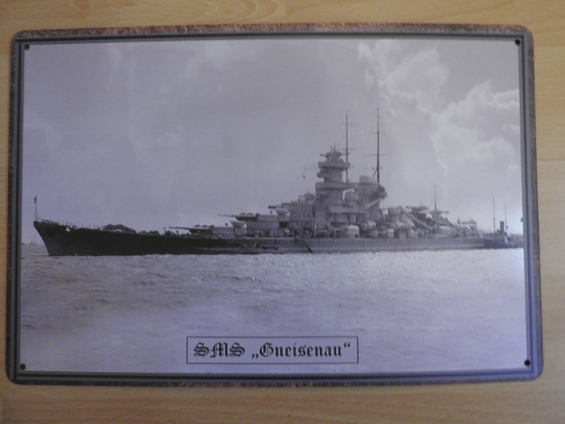 Biete ein Blech-Dekoschild des Schlachtschiffs "Gneisenau" in der Größe 30 x 20 cm. Die Ecken sind gerundet und haben Bohrungen zur Befestigung. Herstellung des Schildes wahrscheinlich im Siebdruckverfahren. Alter und Herkunft sind mit unbekannt.