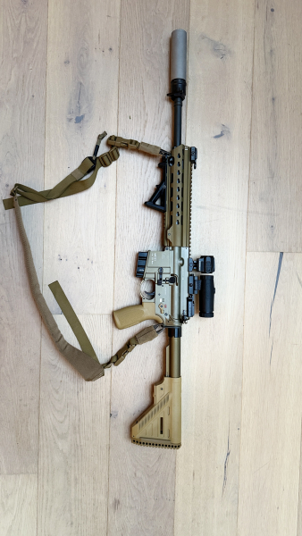 Zum Verkauf steht eine Heckler & Koch MR223 A3 mit dem 16,5 Zoll Lauf in der Farbe RAL8000(Sandfarben).