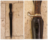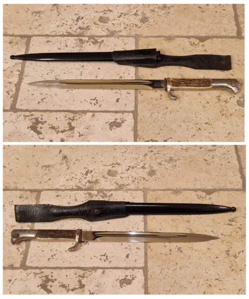 Extra-Seitengewehr / Bajonett SG 84/98: seltene Ausführung der deutschen Gebirgsjäger mit unbeschädigtem Hirschhorn für das Mauser-Gewehr K98 und K98k aus dem 2. Weltkrieg im guten Sammlerzustand 8/10. Blanke vernickelte Klinge ohne Macken, ungeschliffen, Hersteller „Eickhorn, Solingen“. Beide Hirschhorngriffschalen sitzen passgenau am Griff, nichts wackelt! Ein originales einwandfreies Stoßleder sitzt vor der Parierstange. Der Drücker zum Aufpflanzen auf ein Gewehr am Ende des Griffes ist funktionstüchtig, hat oberflächlich aber Gebrauchsspuren in Form von Nickel-Abrieb (siehe Bilder). Die Gesamtlänge ohne Scheide beträgt 36,8 cm, Bajonett in der Scheide misst 40,5 cm. Altersnachweis erforderlich!
