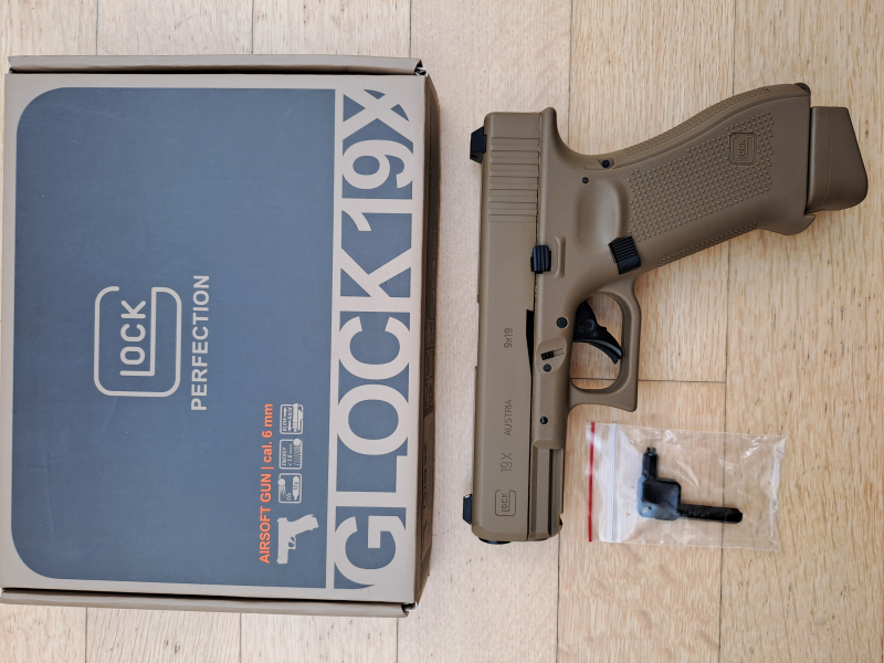 Geliefert wird 1 Stück Glock 19X Airsoft mit Metallschlitten CO2 BlowBack 6mm BB Coyote Tan, 1 Stück Werkzeug zum Einsetzen der CO2 Kapsel, 1 Stück Bedienungsanleitung, 1 Stück Originalverpackung.