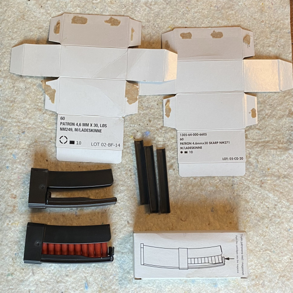 1x rote Ladestreifen mit 10x leere Platzpatronen (Hersteller BF, Bakelitfabrikken, Norwegen)