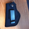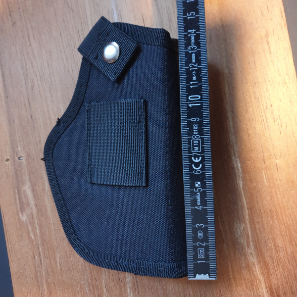 Universalholster für kleine Waffen beidseitig verwendbar Linkshand Rechtshand. Gürtelbefestigung per Clip. Material Nylon. Sicherung mit Druckknopf. Das Holster ist unbenutzt. Welche Waffen alle paßen kann ich nicht sagen. Kleine 5schüßige Revolver so etwas in Richtung Walther PPK usw vermutlich. Versand als Warenbrief.
