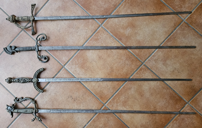 Historisches Schwert.- bzw. Säbelkonvolut, das längste ist ca. 101cm lang. Alle haben Ornamente auf der Klinge. Macht im richtigen Ambiente bestimmt ordentlich was her.