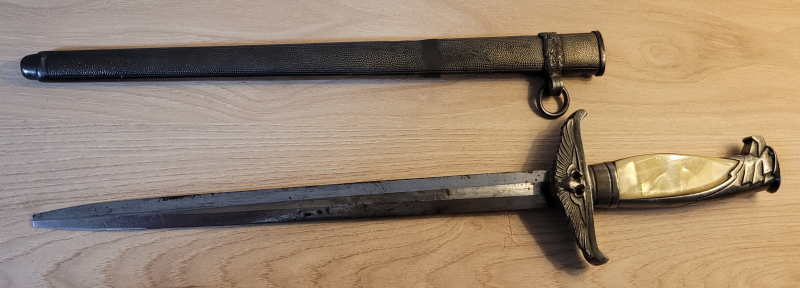 Ich biete hier aus einem Nachlass diesen originalen Dolch für Staatsbeamte , Eickhorn Solingen an . Der Dolch ist entnazifiziert , an der Spitze abgebrochen , an der Scheide fehlt ein Band . Sonst ein schönes Original aus der Zeit , an der Klingenangel und der Parierstange gepunzt . Der Griff versilbert , Buntmetall , Perlmuttgriffschalen unbeschädigt . Der Griff wackelt etwas , lässt sich öffnen , darunter die Punzen .