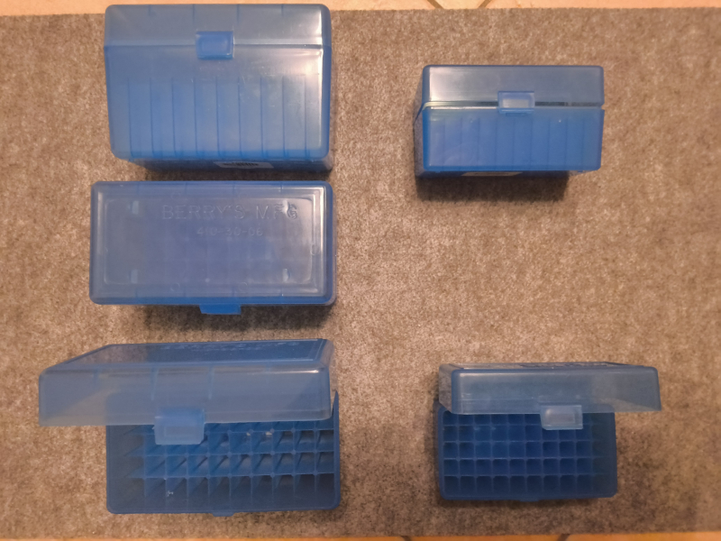 Hallo zusammen, verkaufe hier 3 Berry's Munitionsboxen, Zustand neu. Passend für z.B. Cal.8x57, 8-30-06-.308. Dazu 2 weitere Berry's Munitionsboxen, ebenfalls neu. Passend Cal.222.223. Zustand neu, siehe Bilder.