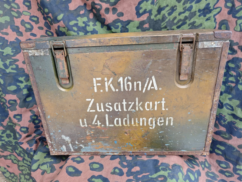 Originale Beschriftung erhalten: „F.K. 16 n/A – Zusatzkart. u. 4 Ladungen“. Es handelt sich um eine originale Holzkiste mit Metallbeschlägen und Tragegriffen zur Aufbewahrung von Zusatzkartuschen und Ladungen.
