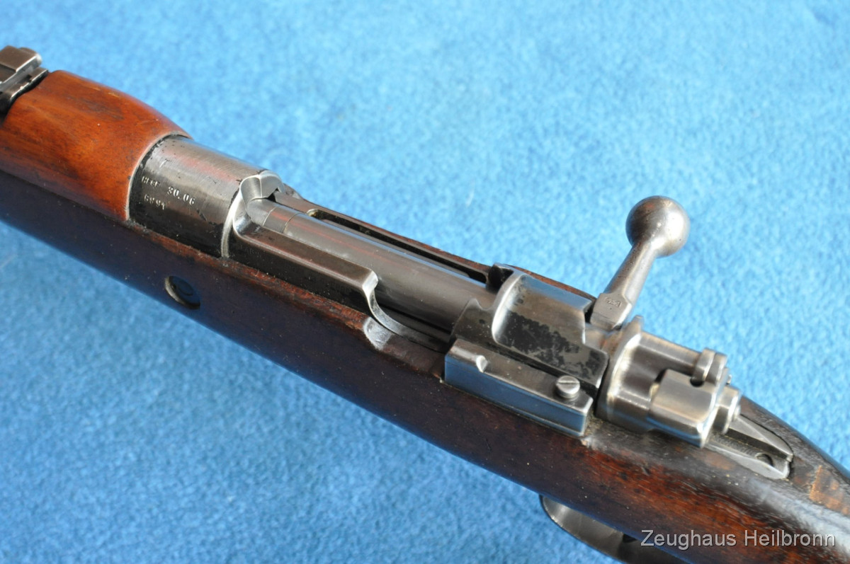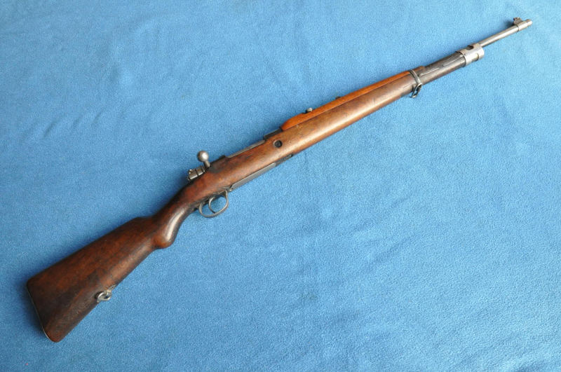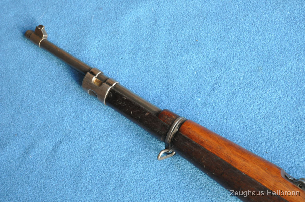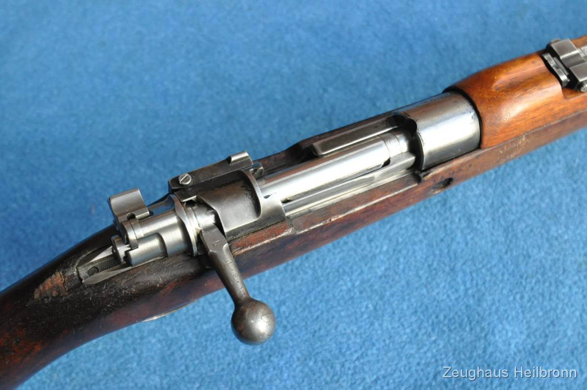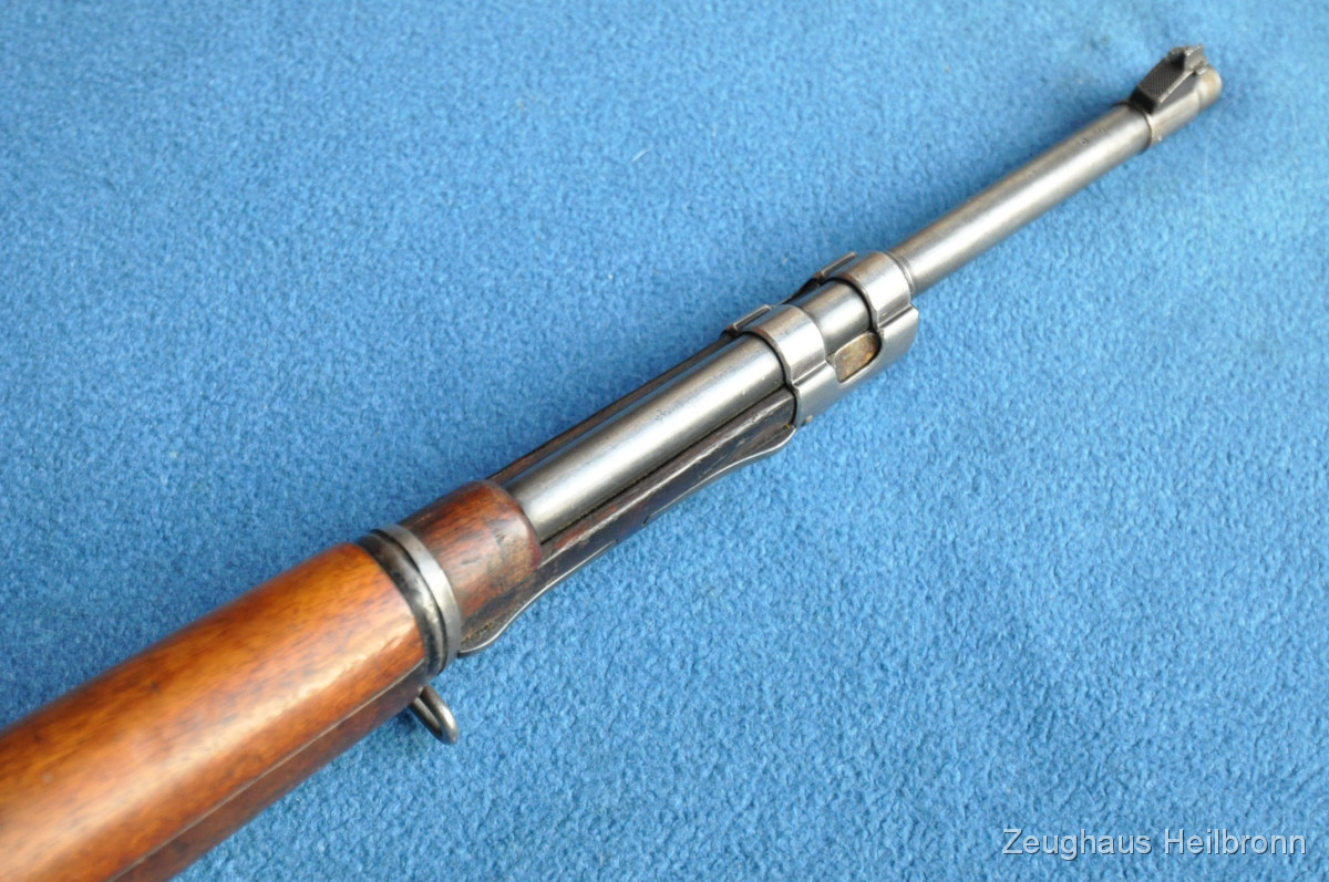 Kongolesische Ordonnanz. Mauser-System, Fertigung FN Herstal. Schwarz ematailliert über phosphatiertem Stahl. Diese Gewehre waren 1960, als der Kongo seine Unabhängigkeit erlangte, in grossem Umfang im Einsatz. Es dauerte nicht lange, bis das Land in einem blutigen Bürgerkrieg versank. Ableger der Force Publique war die neu gegründete A.N.C. (Armée Nationale Congolaise). Die Truppen der A.N.C. waren überwiegend mit Mausergewehren des Modells 1930 bewaffnet, teilweise auch mit FN-49 (SAFN), Vigneron Maschinenpistolen und FAL-Gewehren.