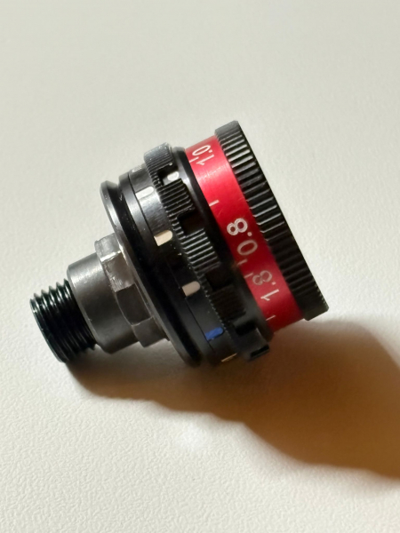 Irisblende von 0,8 bis 1,8 verstellbar. Filterfarben: Hellgrau, Gelb, C41 Peach, C41 Blue, C41 UV