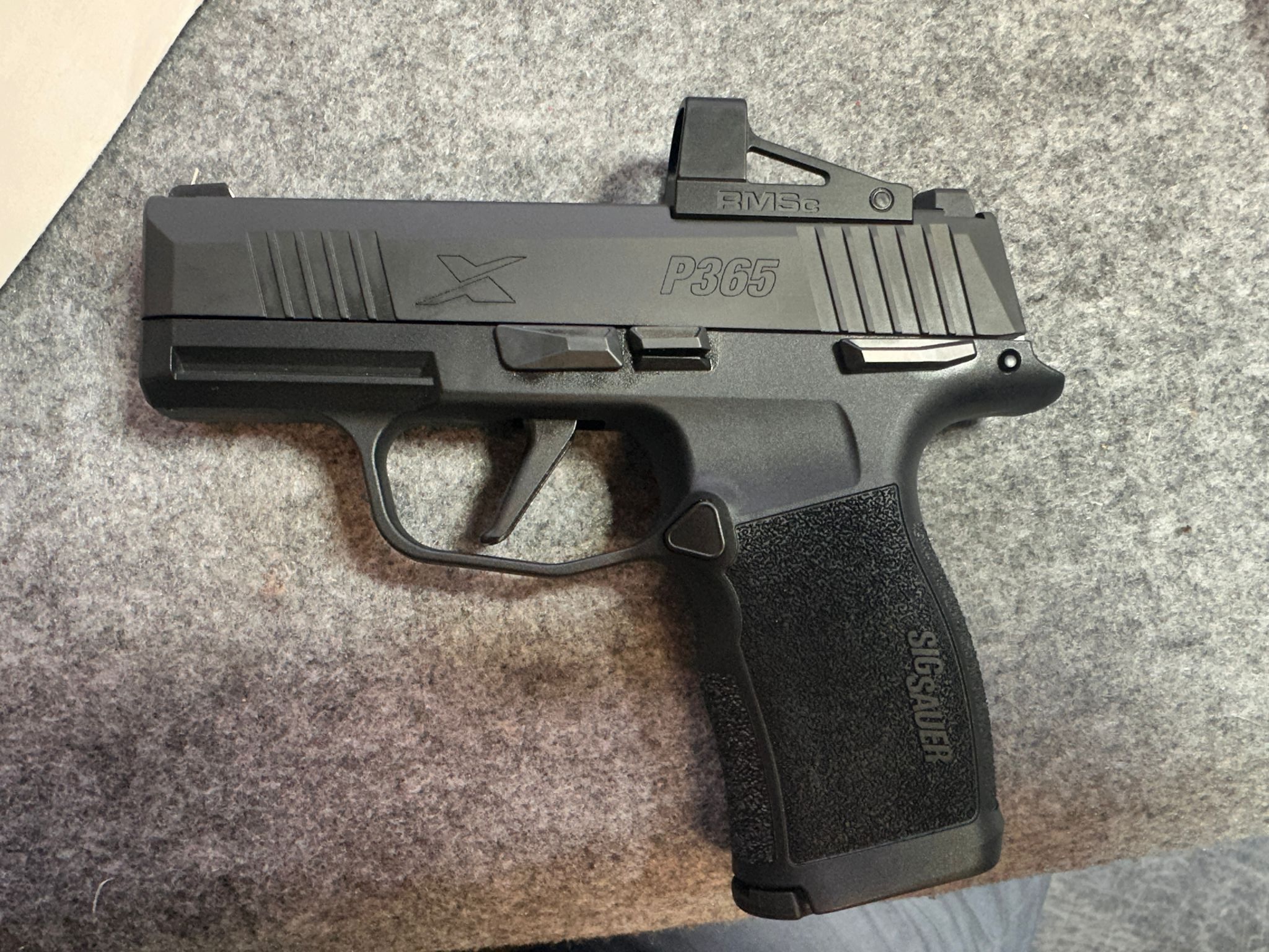 Zum Verkauf steht eine neue und unbenutzte SIG Sauer P365 im Kaliber 9 mm Luger, ausgestattet mit einem Shield RMS-C Red Dot, ebenfalls neu.
