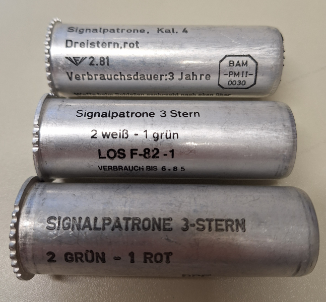 Konvolut aus 3 Stück Signalpatronen 3 Stern 26,5mm / Kal.4 wegen Umstellung des Sammelgebietes. Seltene Stücke die in keiner Sammlung fehlen sollten, Zustand siehe Bilder.