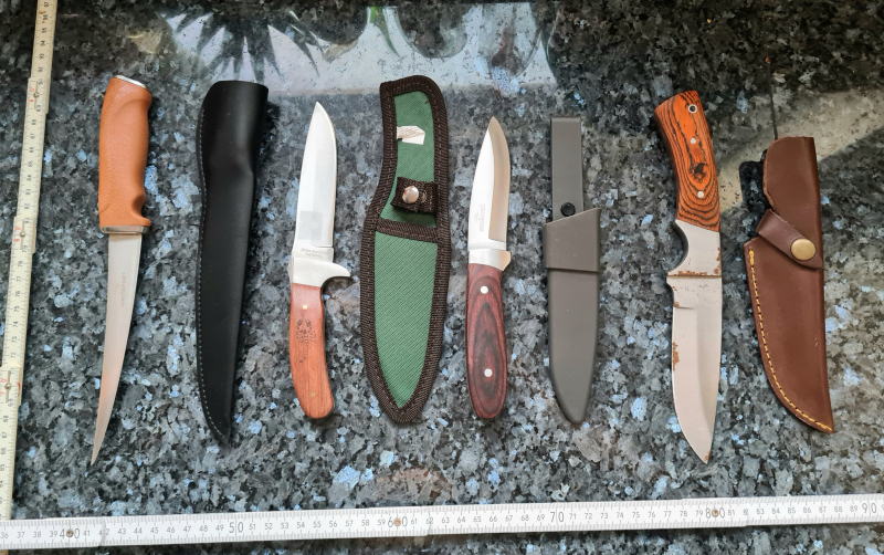 ALLES GEBRAUCHTWARE: Siehe die Fotos. Die Messer habe ich alle beim Fachhändler gekauft - es sind günstige Messer, die aber m. E. ihren Zweck erfüllen (siehe die Fotos) - das sind m. E. keine bekannten Hersteller (und es sind wohl einige Messer "Made in China"). Ein Messer hat an der Klinge schon Rost - siehe Fotos!