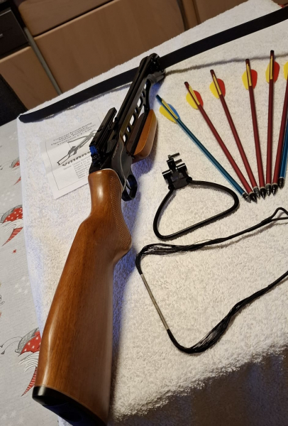 Verkaufe hier eine kaum benutzte Armbrust. Mit 7 Pfeilen. Eine Schraube für das Korn fehlt. Versand im Originalkarton.