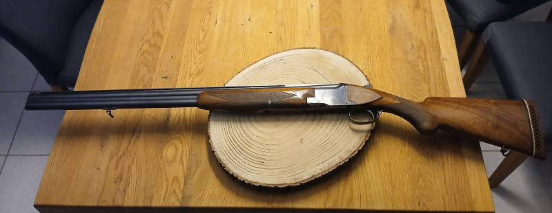 FN B25 Bockflinte mit Kaliber 12/70. Gebraucht aber funktionstüchtig. Läufe blank. Verschluss dicht. Schaft heile mit Druckstellen und Kratzern. Kein Stahlschrotbeschuss. Schaftlänge 34,5 cm bis Abzug. 71 cm Lauflänge. 112,5 cm Gesamtlänge. * Choke oben (voll), ** Choke unten (halb). Ejektoren vorhanden. Laufumstellung und Sicherung auf dem Kolbenhals. Zwei Pufferpatronen dabei.
