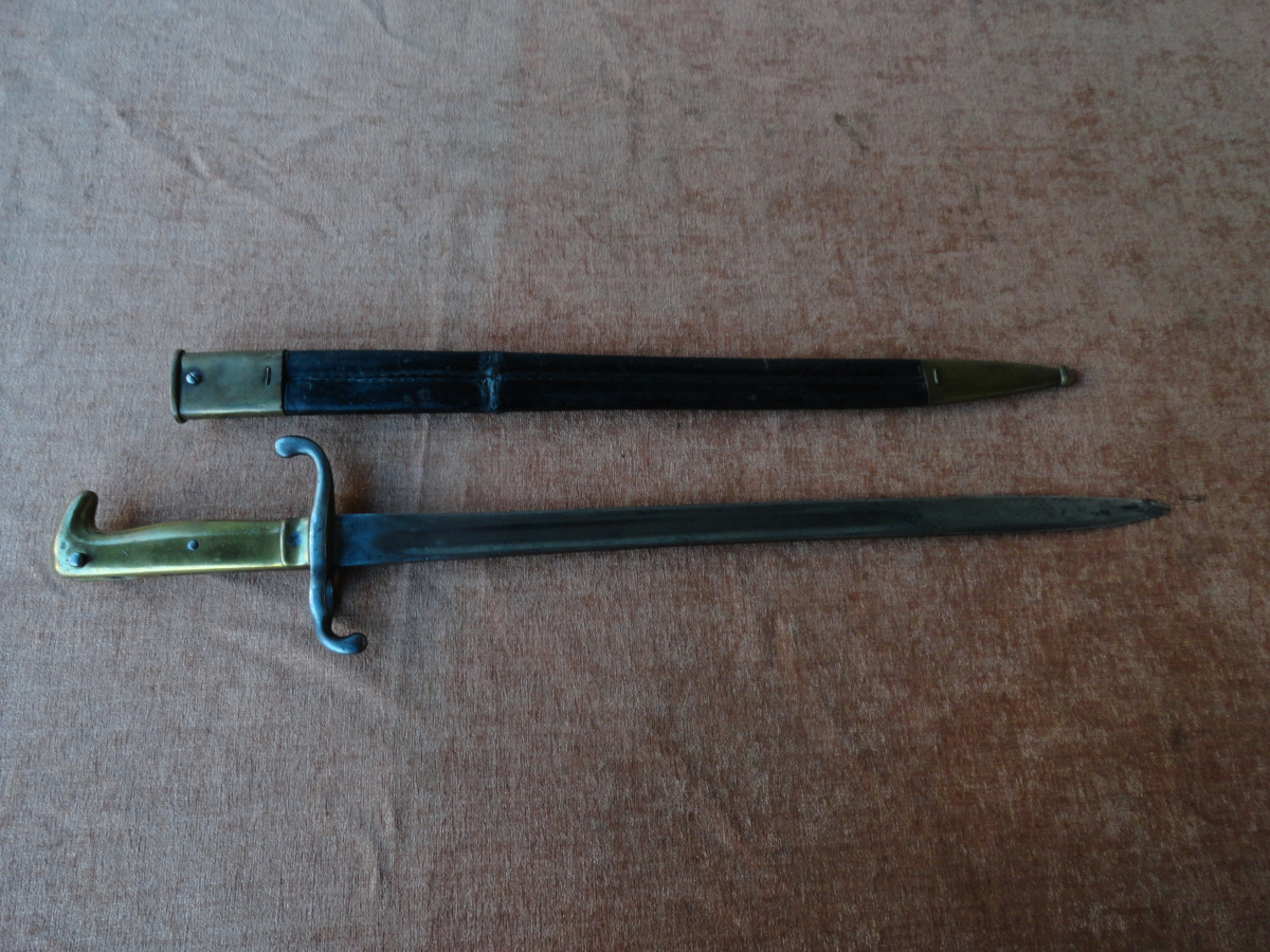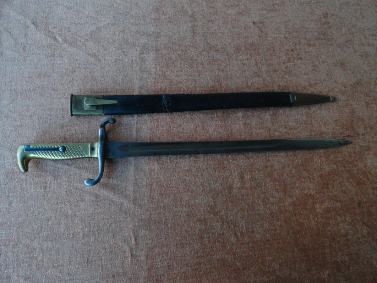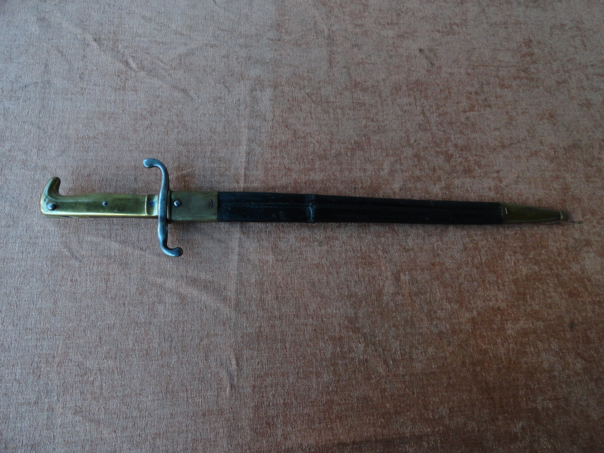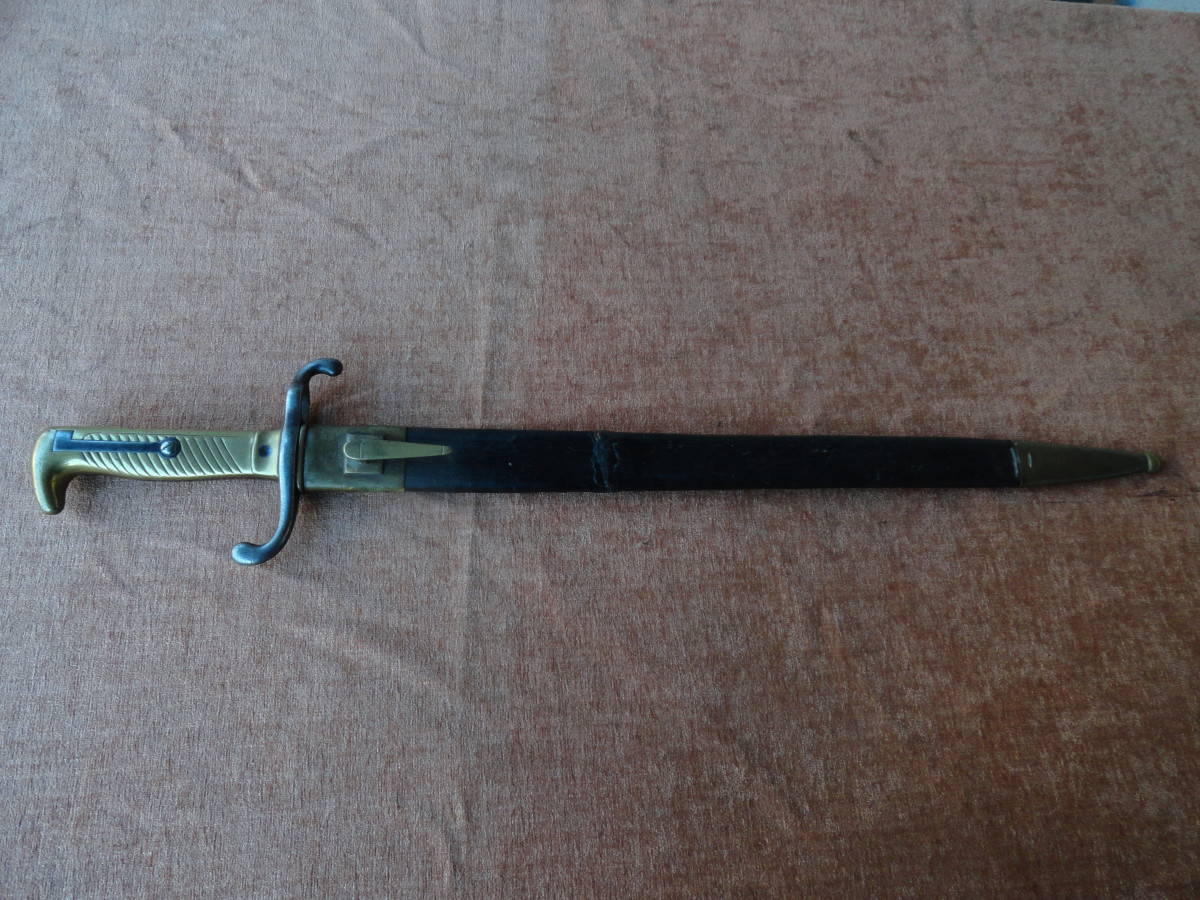 Bajonett M 1871 mit alters und Gebrauchsspuren das Ortblech ist locker, Scheide mit Reparaturstelle. Die Waffe selbst ist ohne die üblichen Stempel Abnahme Truppenteilstempel usw. nur am Adlerkopfförmigen Knauf sind zwei Buchstaben zu sehen und auf der Parierstange ein H. Weitere Angaben kann ich zu dem Stück nicht machen habe dazu kein spezielles Fachwissen aber vielleicht kann ein Egun Mitglied zu diesem Bajonett näheres berichten ! Maße : Gesamtlänge ca. 62,5 cm.