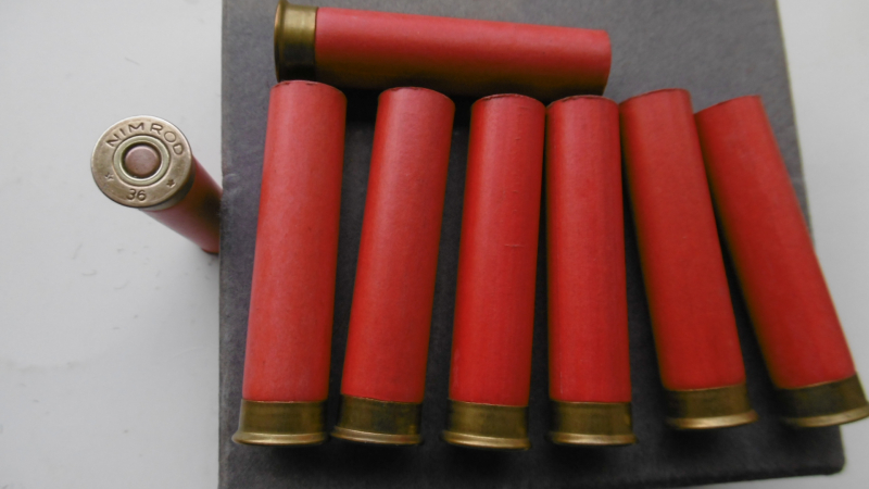 Angeboten werden 8 leere, ungebrauchte Schrothülsen Kal. 36 in neuwertigem Zustand. Marke NIMROD, hergestellt in den 1930er Jahren von Sellier&Bellot in Schönebech/Elbe.
