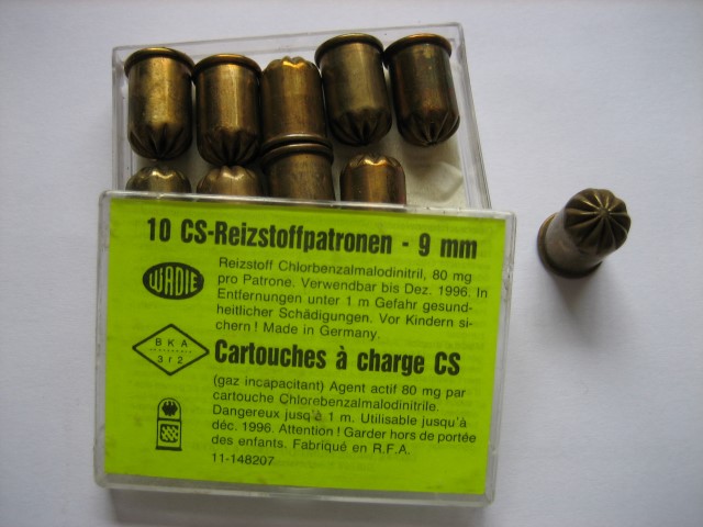Aus Sammlungsauflösung wird angeboten -- Eine Schachtel mit 10 Stk. Gaspatronen - Faltverschluß (s. Foto) - Hersteller WADIE - 9 mm für Revolver - Ladung: 80 mg. Chlorbenz ... - Patronen wurden kühl und trocken gelagert - Haltbar bis 12/1996-- Patronen können Oxidationsspuren aufweisen +++ Der Versand erfolgt mit DHL (unversichert). Die Versandkosten gelten nur für Deutschland. -- Kein Internationaler Versand -- Privatverkauf, daher keine Gewährleistung, Garantie oder Rücknahme. Bei Fragen einfach mailen.