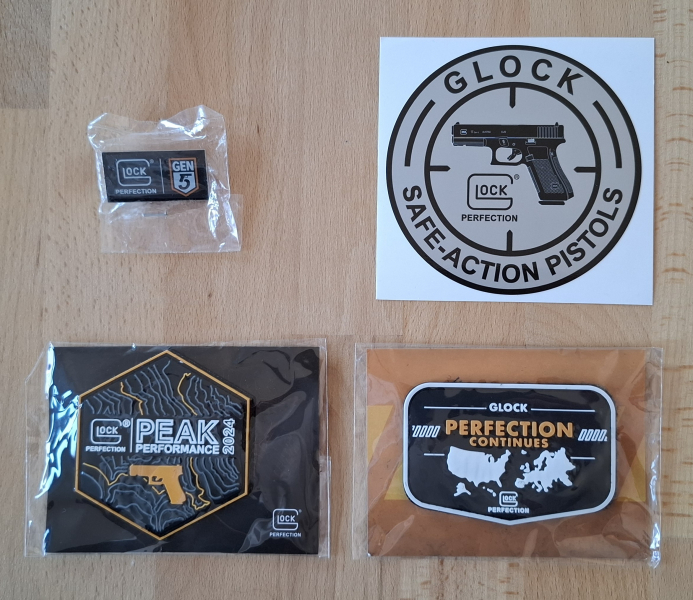 Sie bieten auf 2 Glock PVC Patches mit Klett auf der Rückseite, 1 Anstecker und einen Aufkleber. Patches von Glock USA.