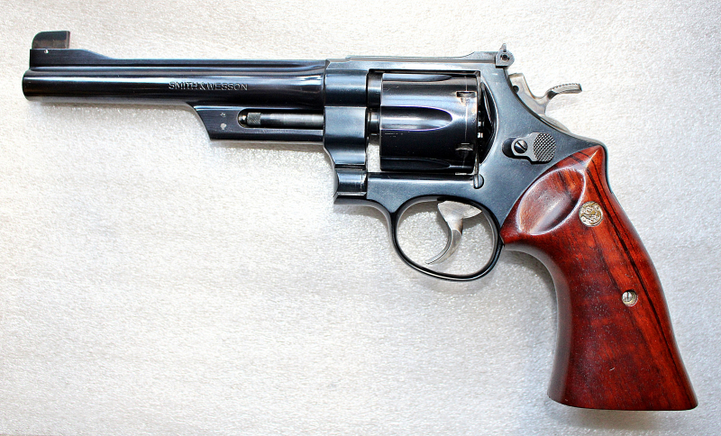 Hervorragend gefertigter Revolver in bester S&W-Qualität. Wohl nur sehr wenig geschossen. Perfekter Schlossgang und Abzugverhalten. Bunt gehärtete Schlossteile. Breiter Abzug. Fein justierbare Mikrometervisierung. Hochglanzbrünierung. Spiegelblanker 6" langer Lauf. Rutschfeste Holzgriffschalen. Sechsschüssig. Natürlich ohne Magnumrille. Mit aktuellen deutschen Beschuss. Komplett mit Bedienungsanleitung und allen Dokumenten.