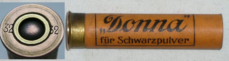 Angeboten wird 1 leere, ungebrauchte Schrothülsen Kal. 32 in neuwertigem Zustand, Marke DONNA, hergestellt in den 1930er Jahren von Genschow.