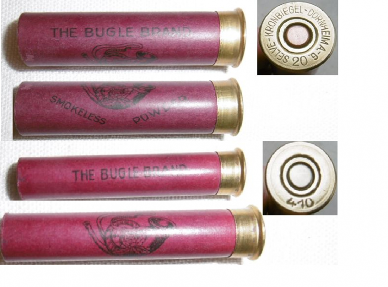 Angeboten wird 1 Paar leere, ungebrauchte Schrothülsen Kal. 20 + .410 in neuwertigem Zustand, Marke "THE BUGLE BRAND", hergestellt Ende der 1930er Jahren von Selve-Kronbiegel-Dornheim A-G. Ein Exportauftrag für Australien